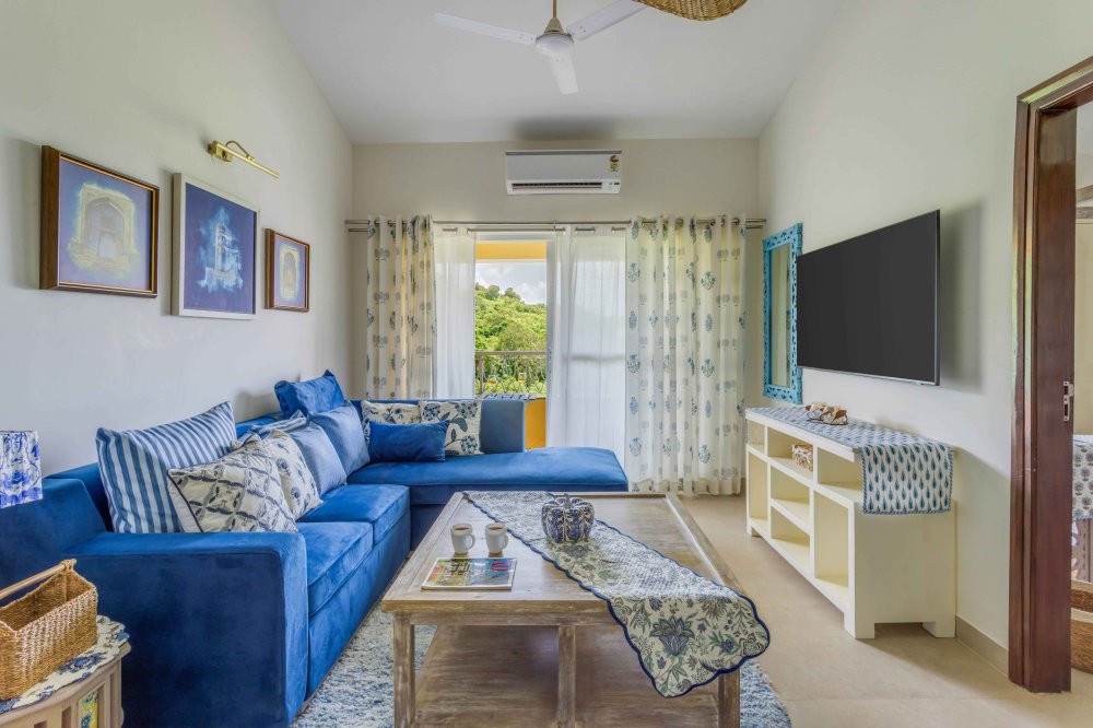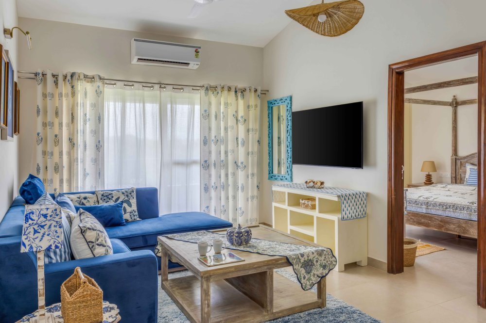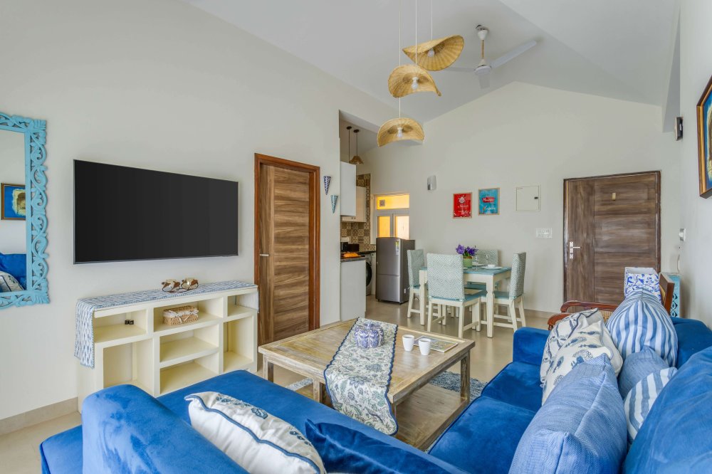 A premium 2BHK apartment in the heart of Candolim, North Goa, just 10 minutes from the beach. Thoughtfully designed, it features a chic living room, a modern kitchen, and 2 elegant bedrooms. Guests also enjoy access to a large swimming pool, a well-equipped gym, and a secure, well-maintained complex.