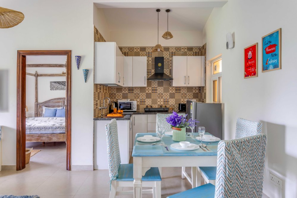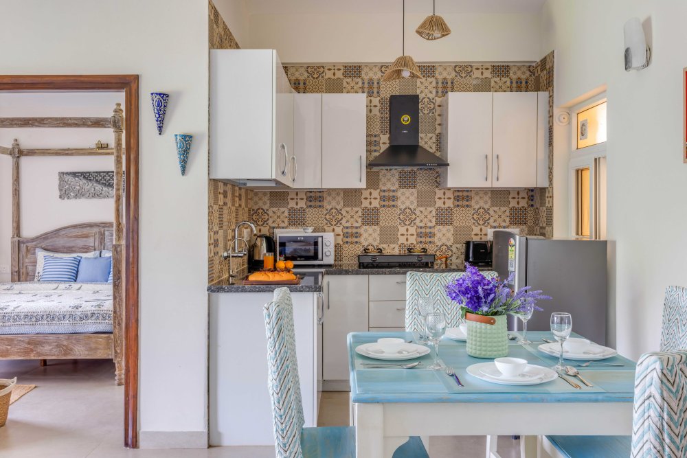 - The home comes with a fully equipped kitchen, which is sufficient for long stays too. It includes a microwave, electric kettle, refrigerator, dishes and silverware, stove, cooking basics (pots and pans), salt and pepper, wine glasses, dining table, and toaster