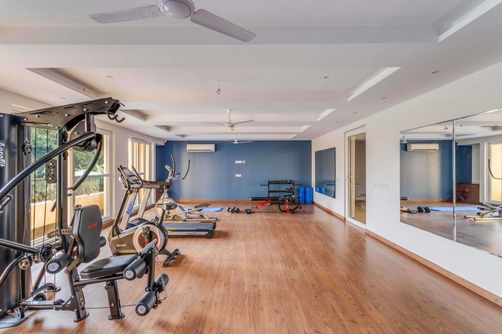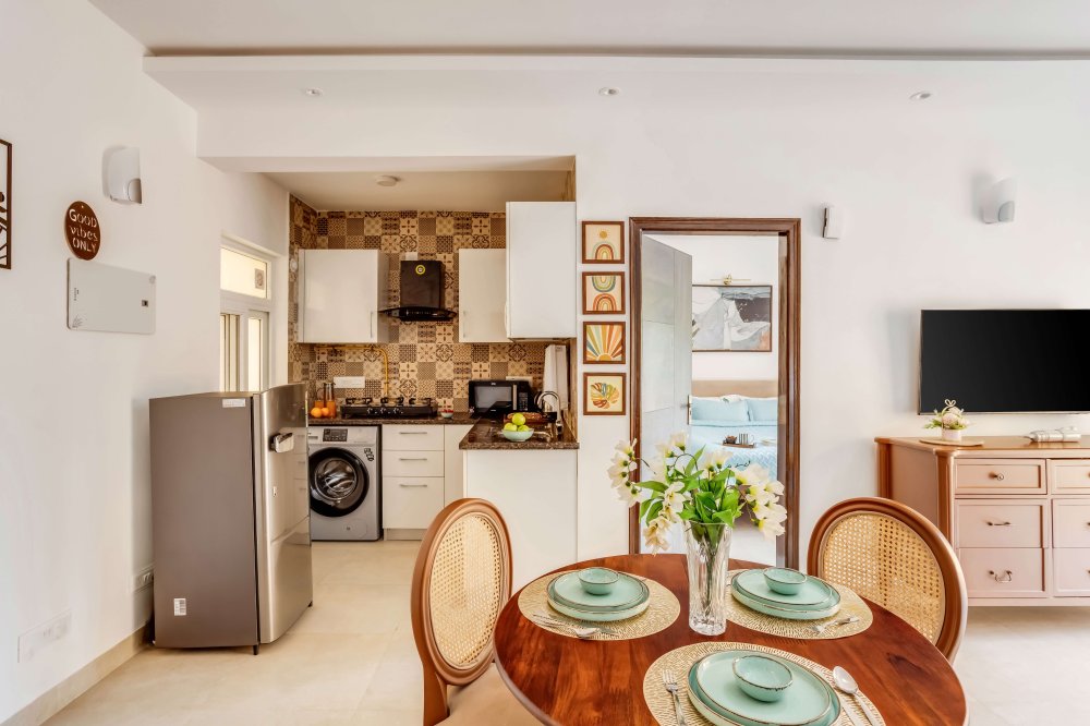 - The home comes with a fully equipped kitchen, which is sufficient for long stays too. It includes a microwave, electric kettle, refrigerator, OTG, dishes and silverware, stove, cooking basics (pots and pans), salt and pepper, wine glasses, dining table, and toaster