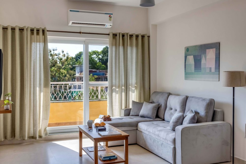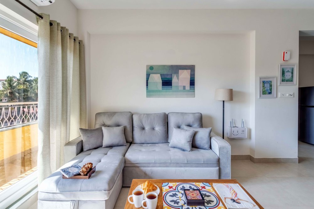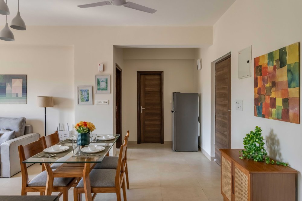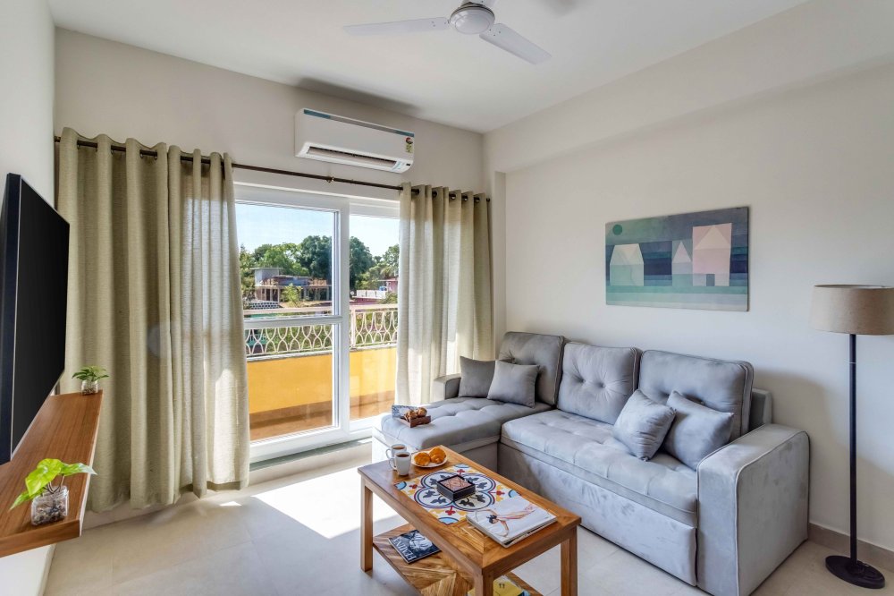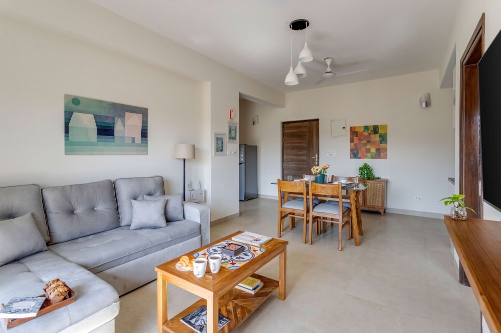 A premium 2BHK apartment in the heart of Candolim, North Goa, just 10 minutes from the beach. Thoughtfully designed, it features a chic living room, a modern kitchen, and 2 elegant bedrooms. Guests also enjoy access to a large swimming pool, a well-equipped gym, and a secure, well-maintained complex.