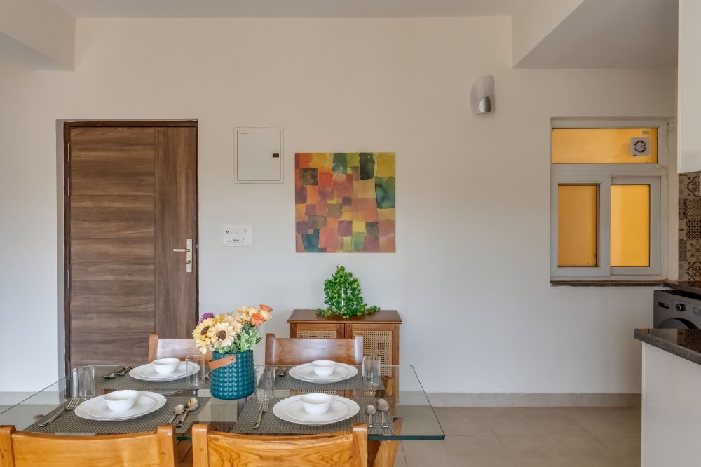 - The home comes with a fully equipped kitchen, which is sufficient for long stays too. It includes a microwave, electric kettle, refrigerator, dishes and silverware, stove, cooking basics (pots and pans), salt and pepper, wine glasses, dining table, and toaster