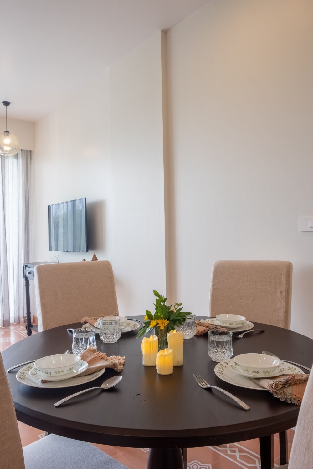 - The home comes with a fully equipped kitchen, which is sufficient for long stays too. It includes a microwave, electric kettle, refrigerator, OTG, dishes and silverware, stove, cooking basics (pots and pans), salt and pepper, wine glasses, dining table, and toaster