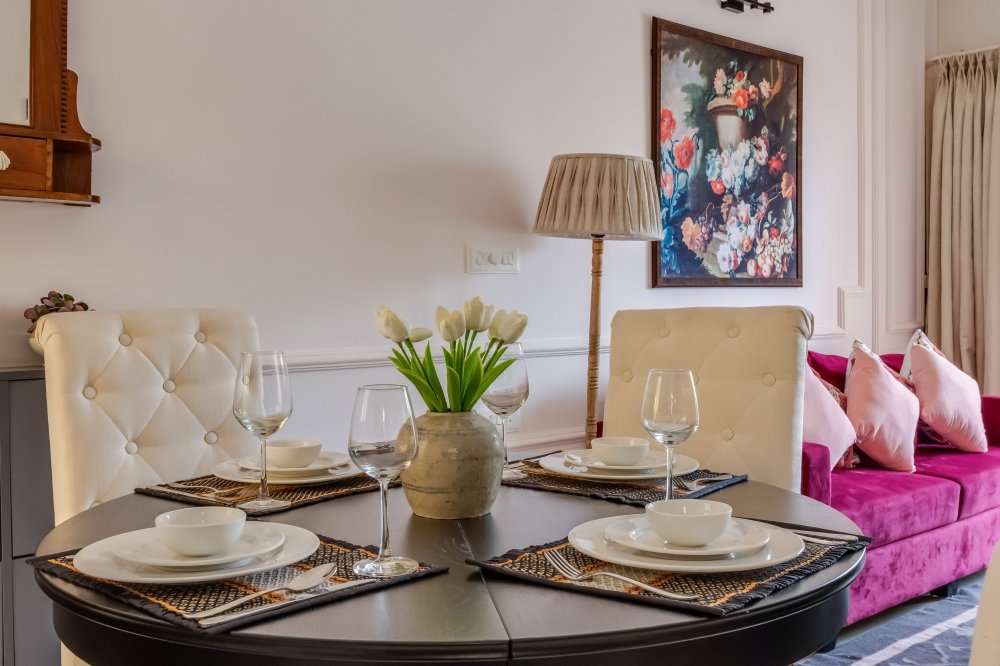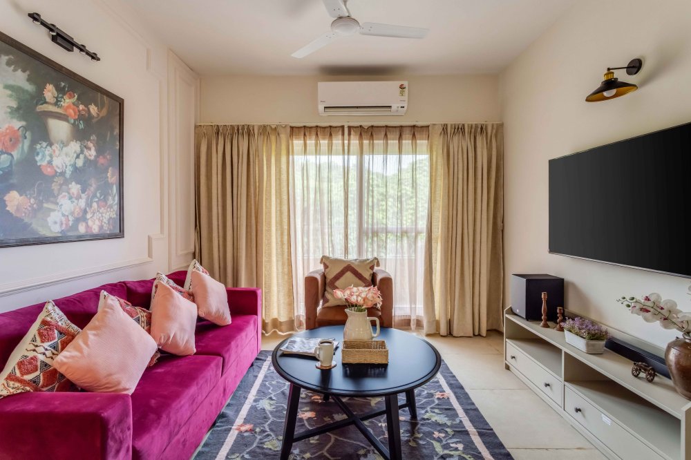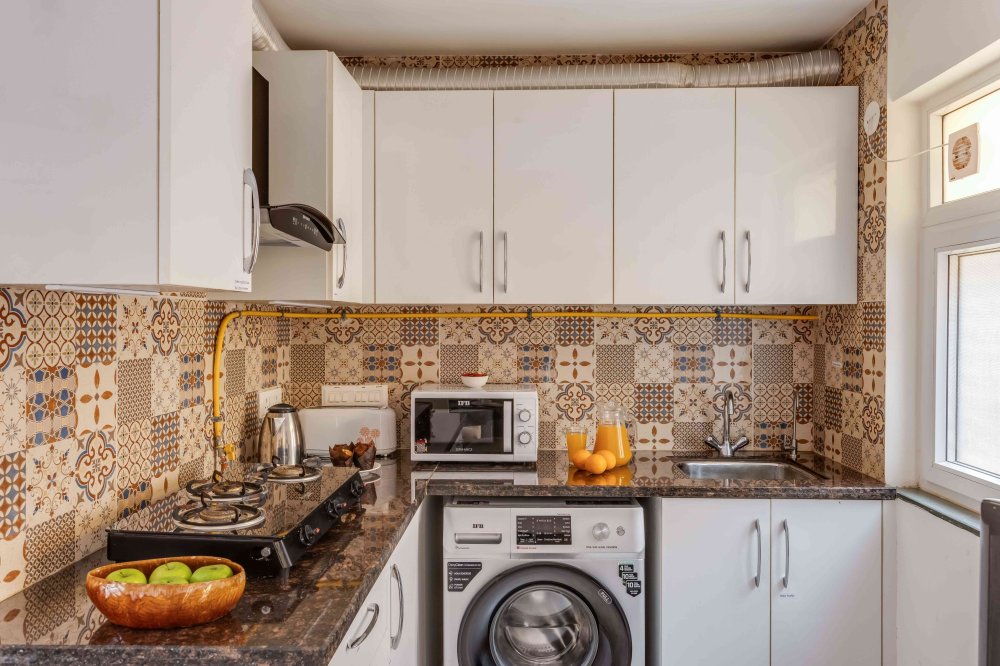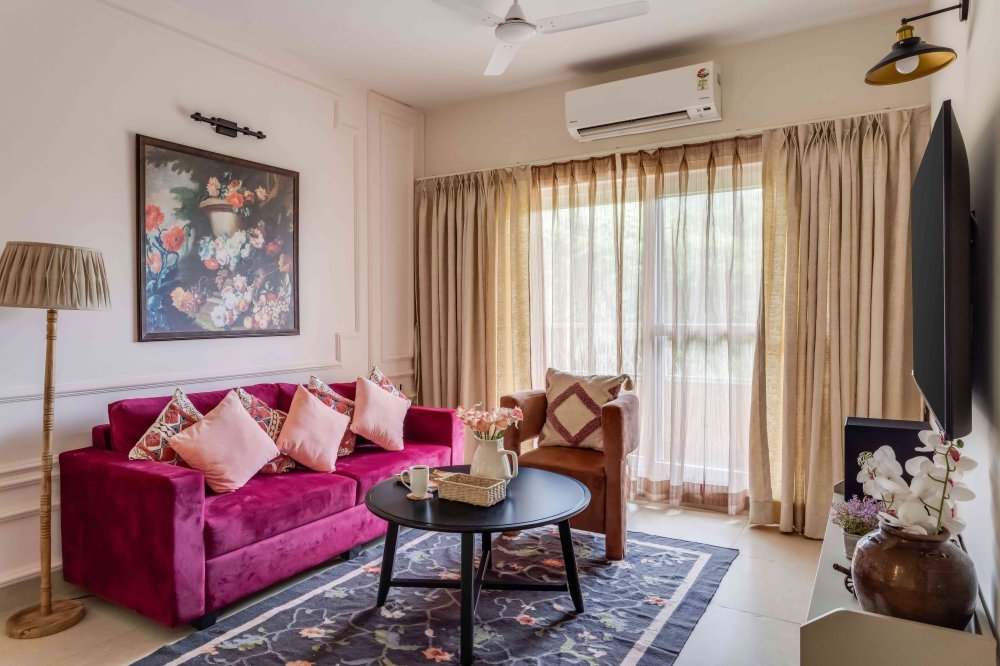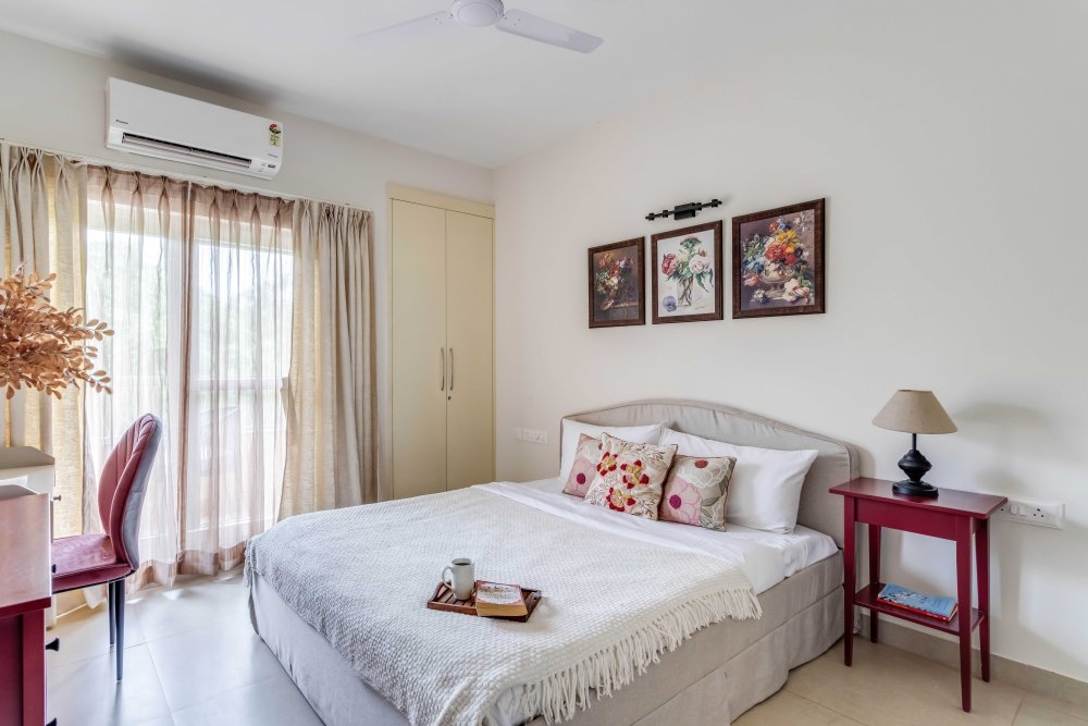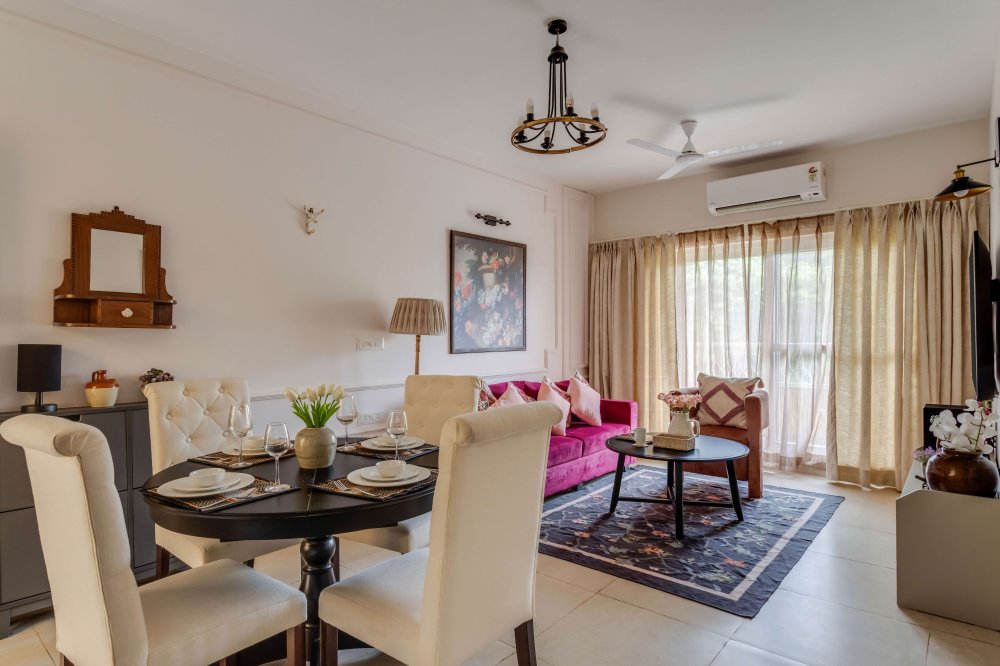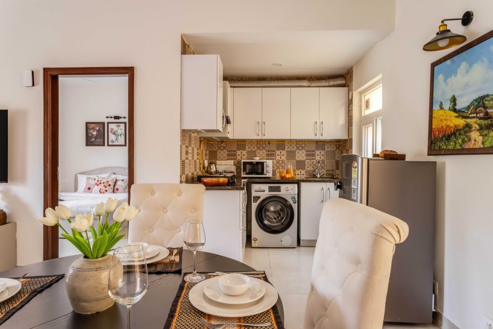 - The home comes with a fully equipped kitchen, which is sufficient for long stays too. It includes a microwave, electric kettle, refrigerator, OTG, dishes and silverware, stove, cooking basics (pots and pans), salt and pepper, wine glasses, dining table, and toaster
