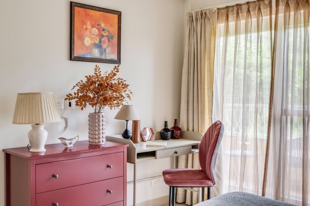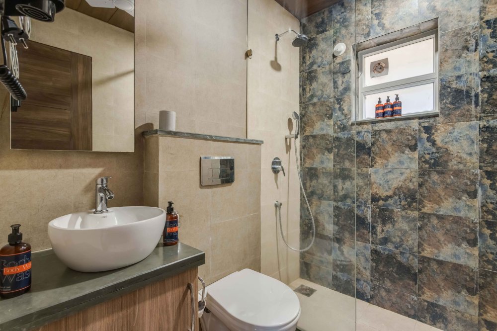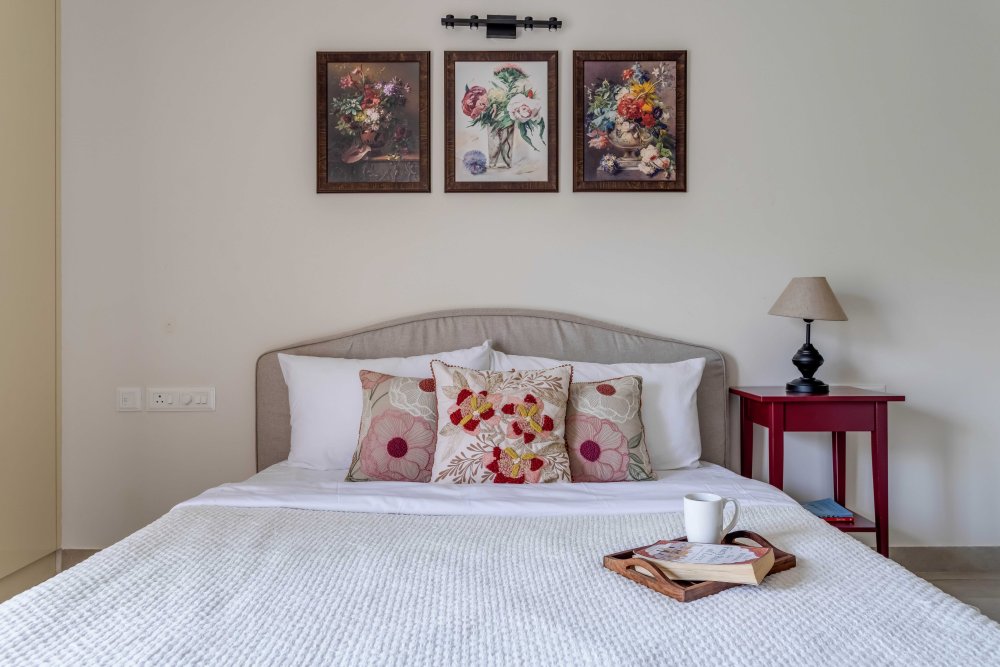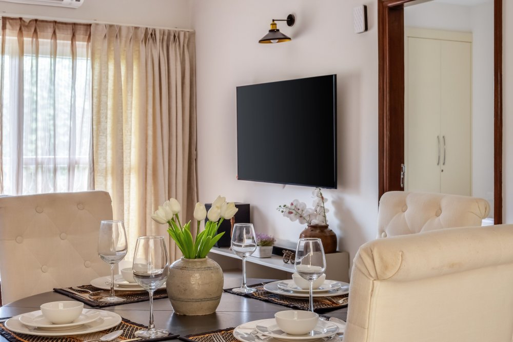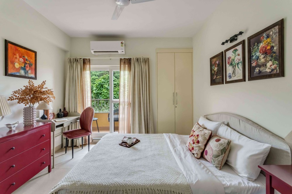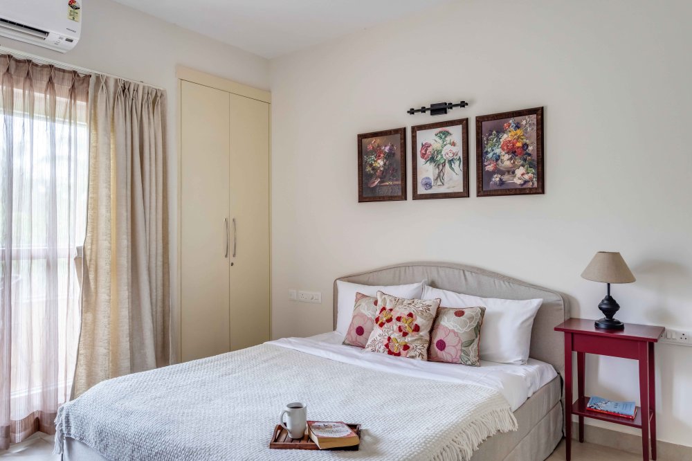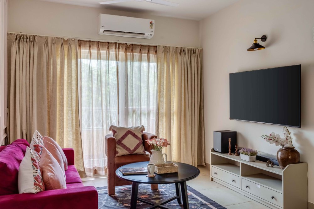 - The home comes with a fully equipped kitchen, which is sufficient for long stays too. It includes a microwave, electric kettle, refrigerator, OTG, dishes and silverware, stove, cooking basics (pots and pans), salt and pepper, wine glasses, dining table, and toaster