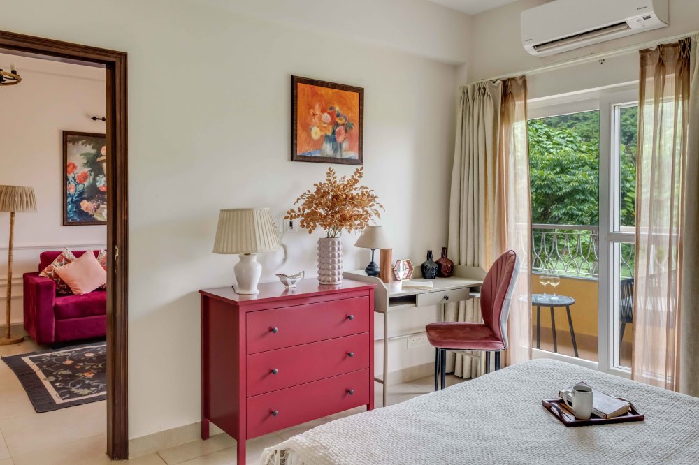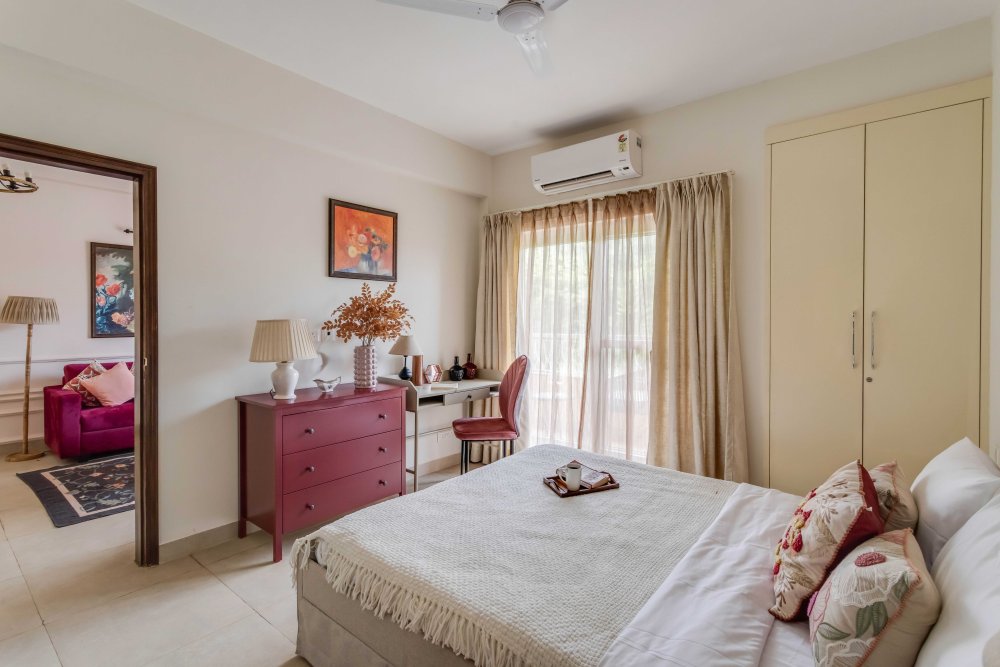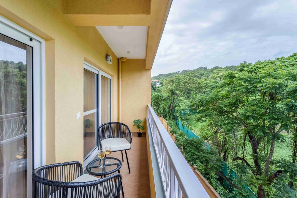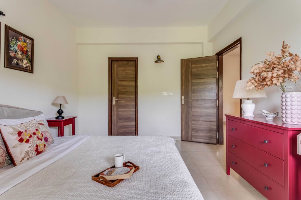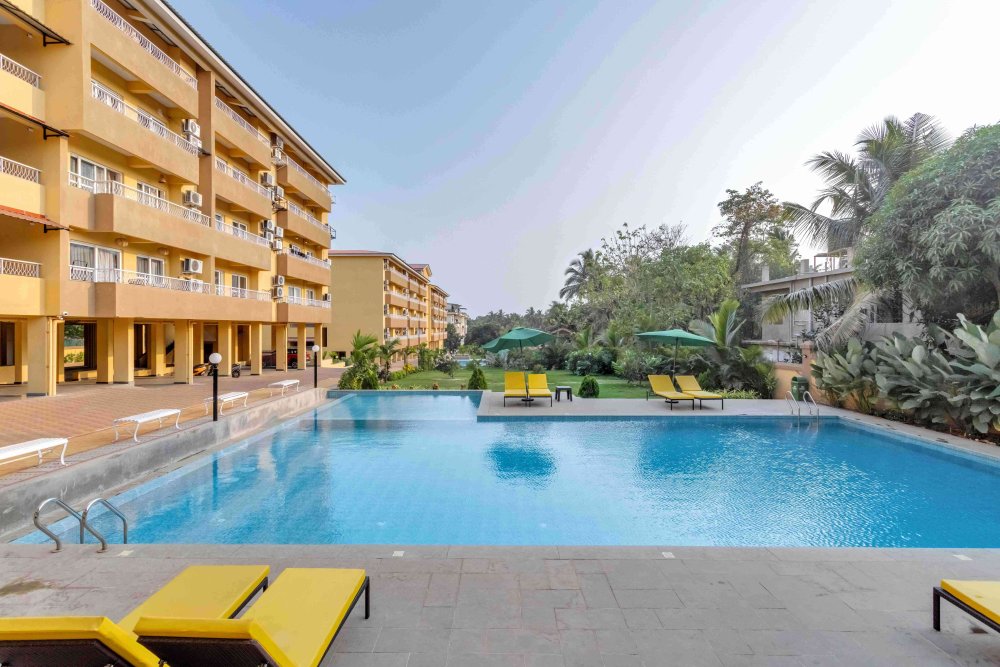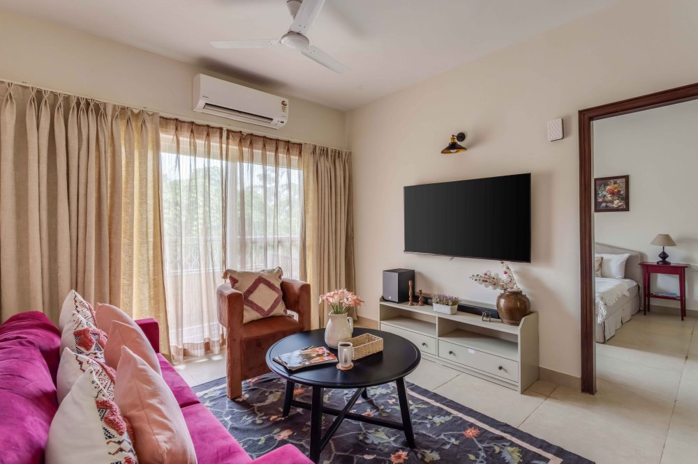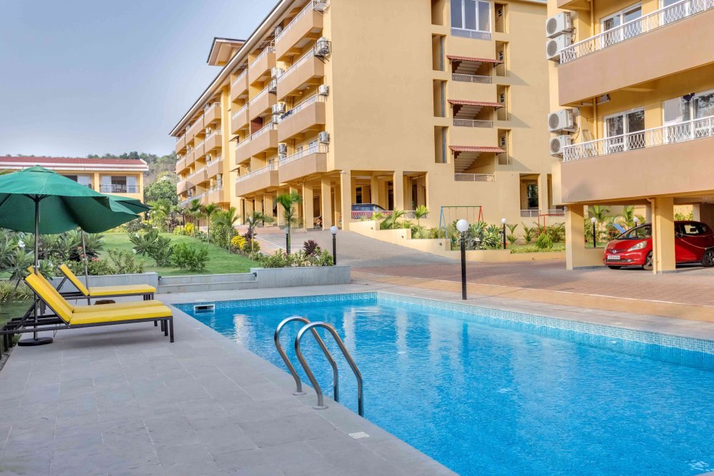 A luxurious 1BHK apartment in the heart of Candolim, North Goa, just a 5-minute drive from the beach. This exquisitely designed space features a stylish living room, modern kitchen, and elegant bathroom. Enjoy essential amenities such as a spacious swimming pool and a children’s park. Nestled in a plush, urban area, the apartment offers serene views of the lush green lawn and a sparkling swimming pool.