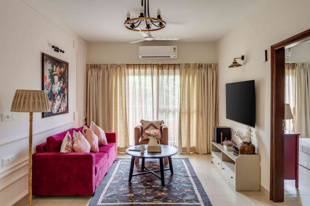 Step into this luxury 1BHK apartment featuring a spacious living room seamlessly connected to a fully equipped kitchen. The bedroom includes an attached bathroom and a private balcony, perfect for relaxing with views of lush greenery and the soothing sounds of nature.