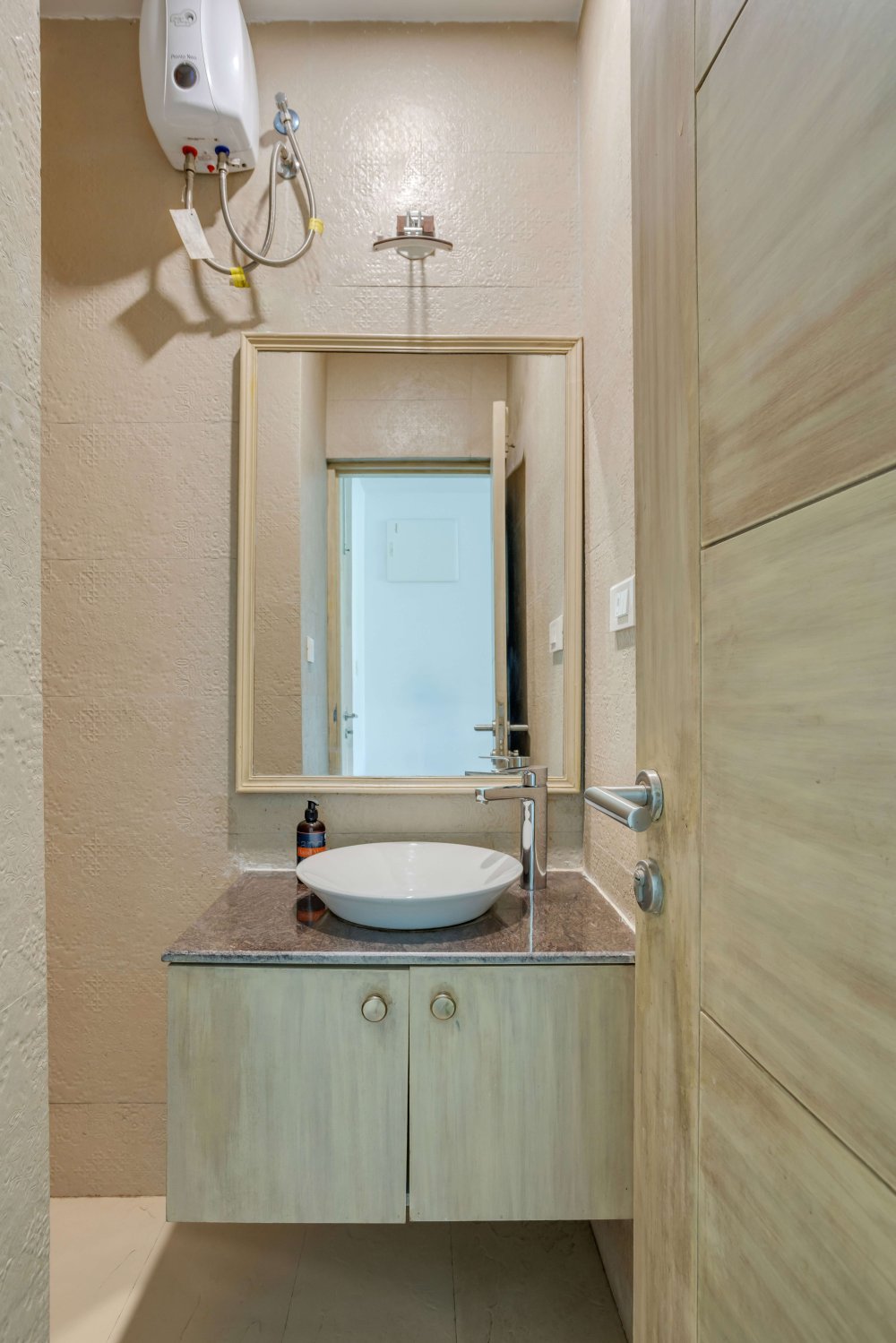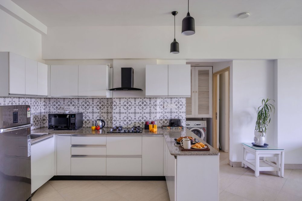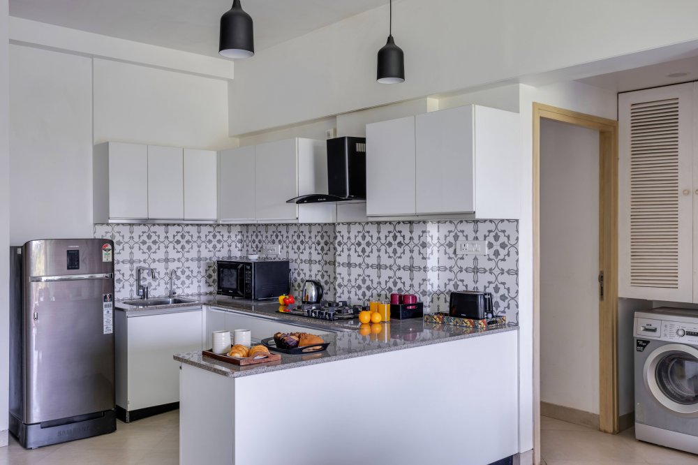 - The home comes with a fully equipped kitchen, which is sufficient for long stays too. It includes a microwave, electric kettle, refrigerator, OTG, dishes and silverware, stove, cooking basics (pots and pans), salt and pepper, wine glasses, dining table, and toaster