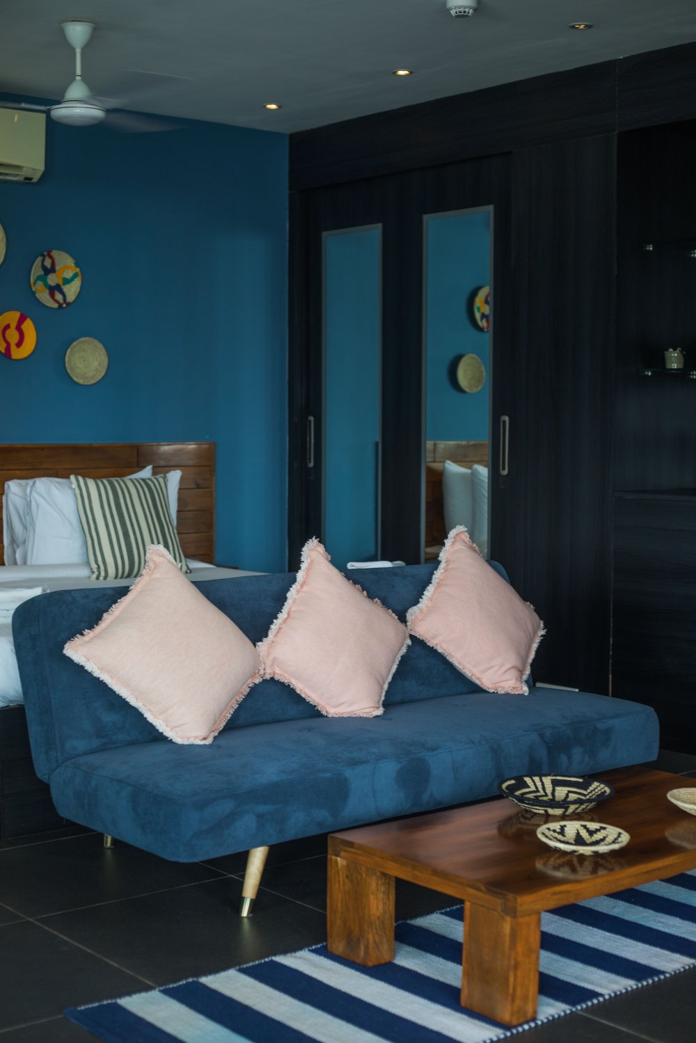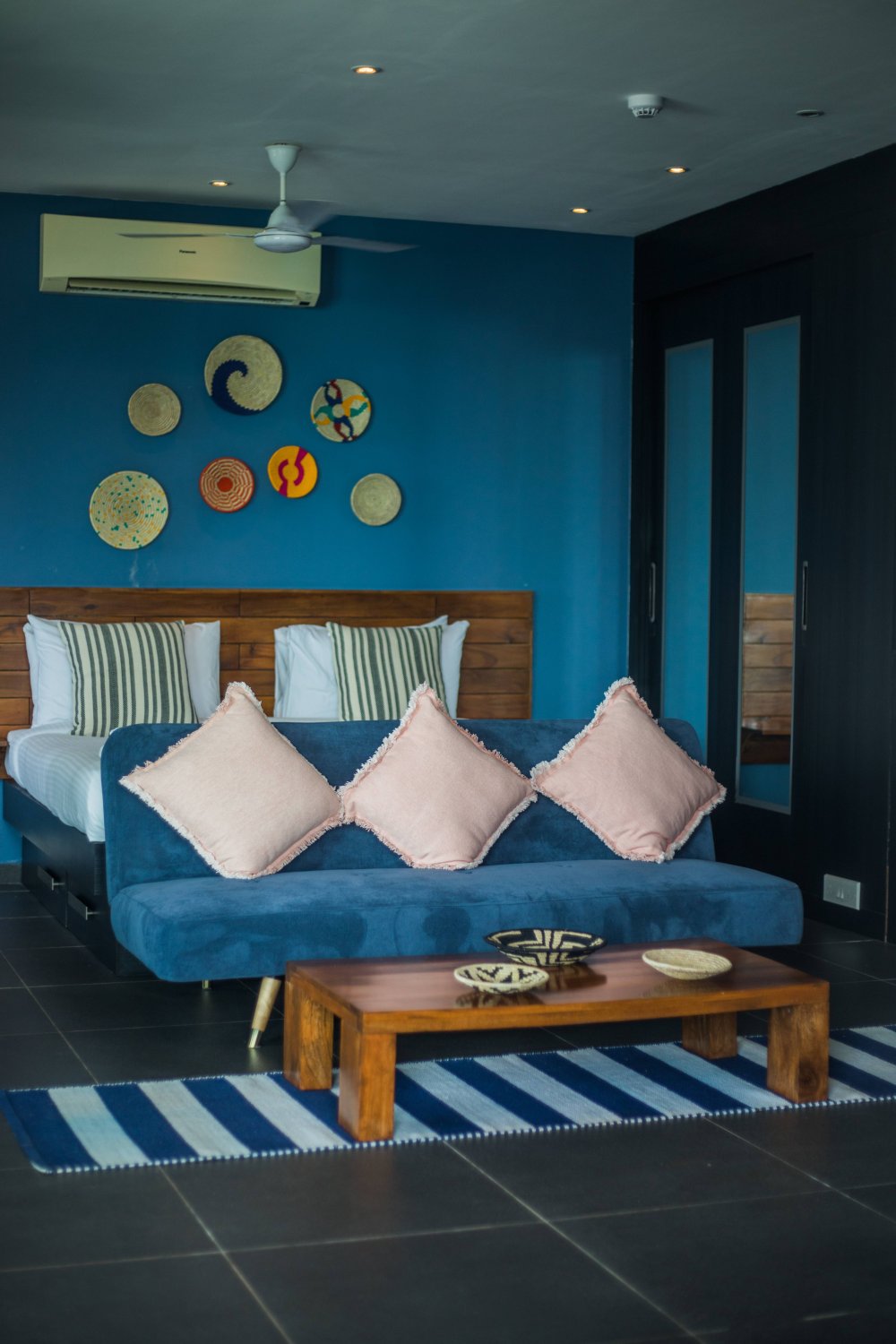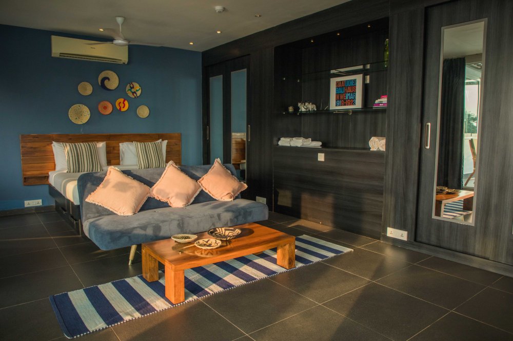 Located in the tiny bay facing village between Reis Magos and Nerul in North Goa, overlooking the bay and lush green views, split over two floors the space is environment-friendly, using locally sourced materials and textiles. The stylish bedroom is extremely spacious with an ensuite bathroom and steam room and has uninterrupted views of the sea. The bedroom also has a storage space for your personal belongings.