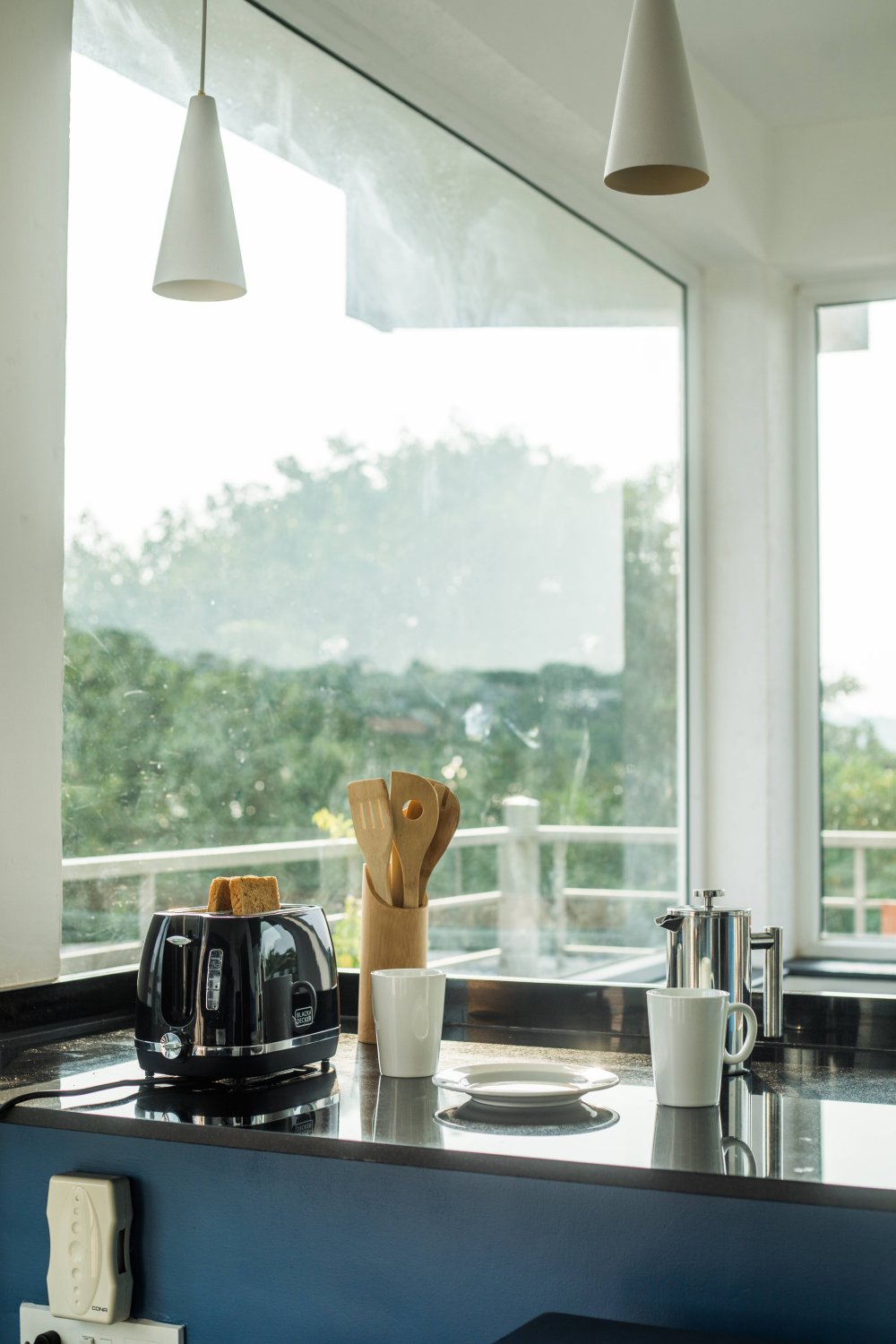 The apartment comes equipped with a fully functional kitchen, including microwave, kettle, toaster and fridge. It is also stocked with a full set of crockery, cutlery and a variety of glassware—wine glasses, champagne flutes, juice tumblers and coffee mugs. In case you would like to cook, we have also stocked the kitchen with silicon tools, pots and pans beside the usual amenities.