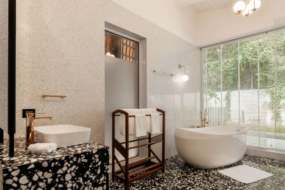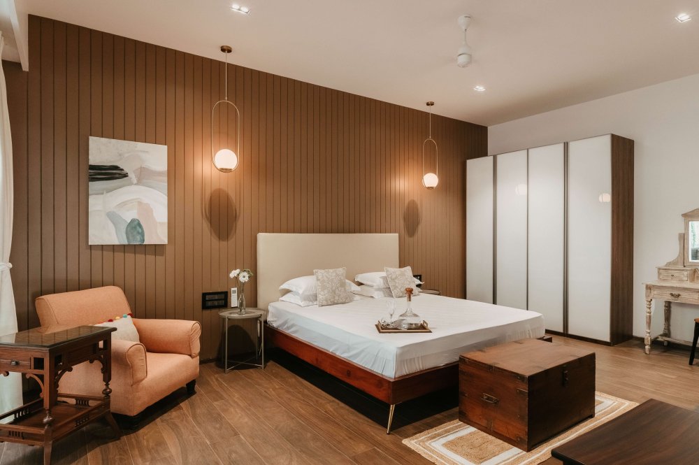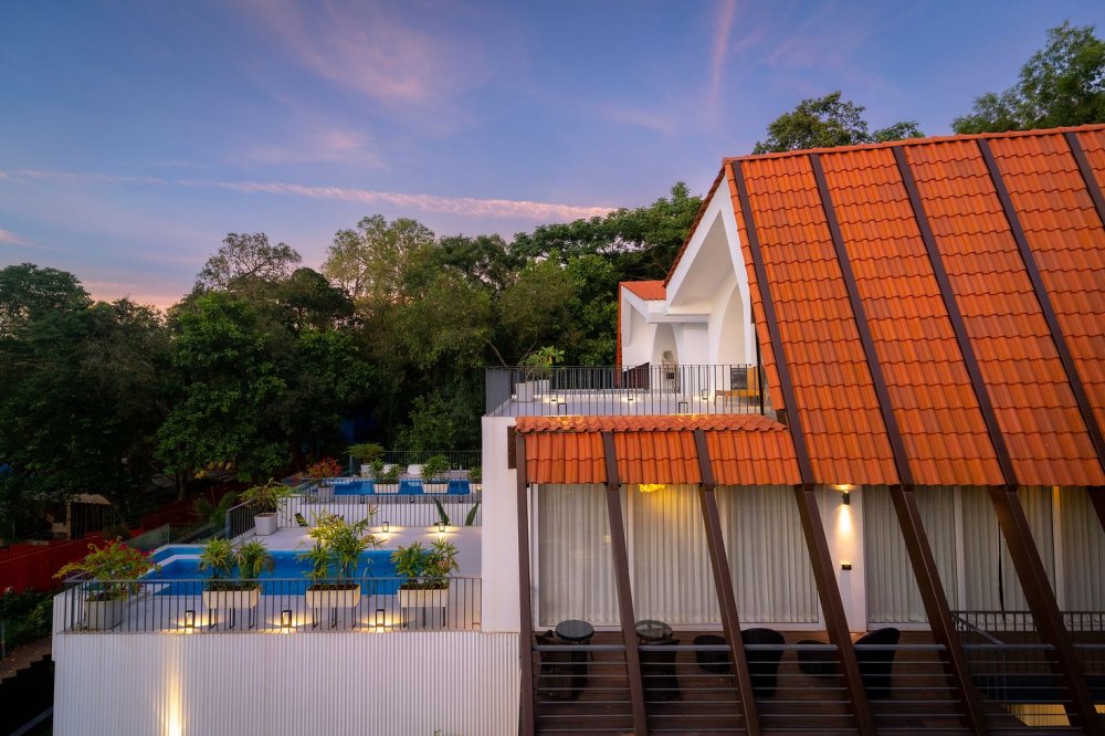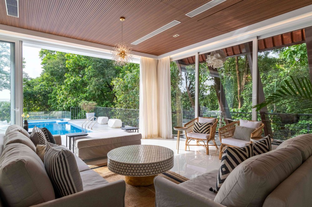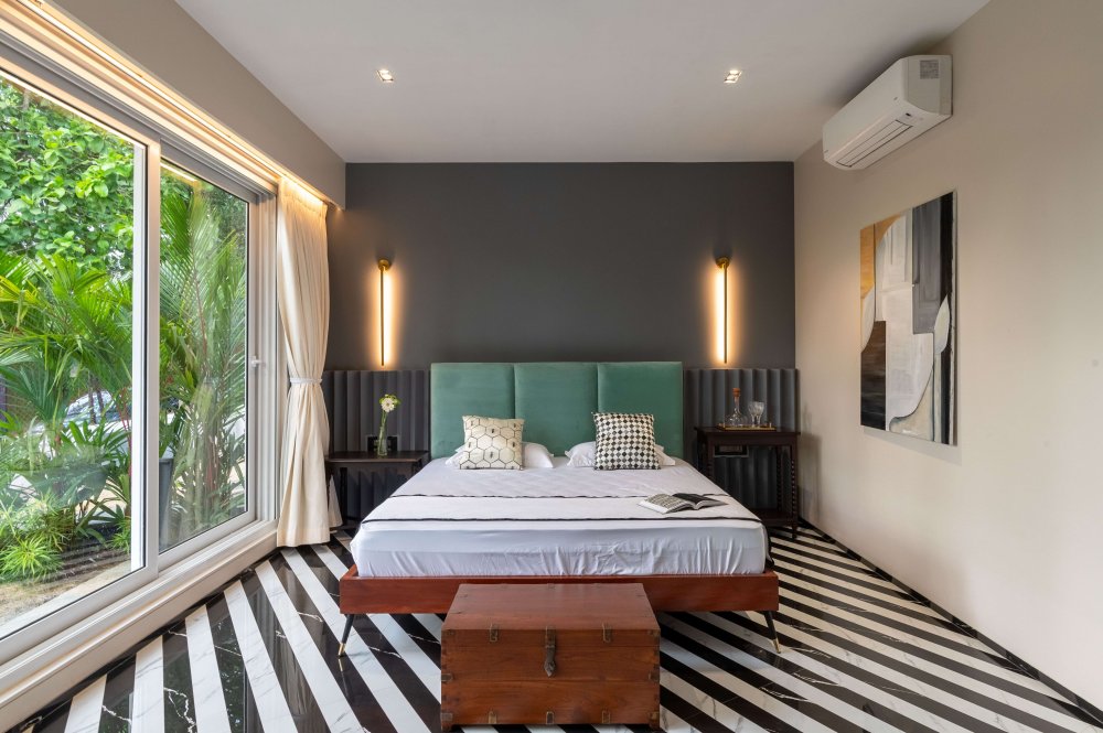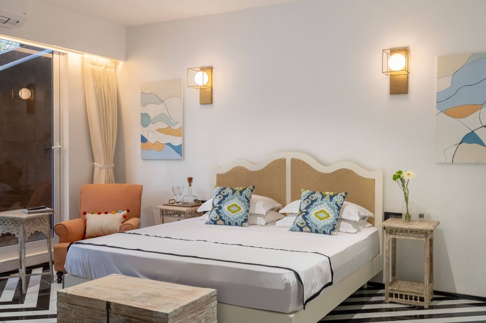A luxurious 4BHK villa tucked away in the lush, laid-back neighborhood of Siolim, North Goa. One of four identical villas, Aria pairs bold, contemporary design with vintage charm—creating a sophisticated hideaway for families, friends, or groups traveling together. With a spacious infinity pool, a wooden deck for sun-soaked lounging, and a beautifully curated island-style kitchen, this villa is your ideal setting for connection, celebration, or pure relaxation.
