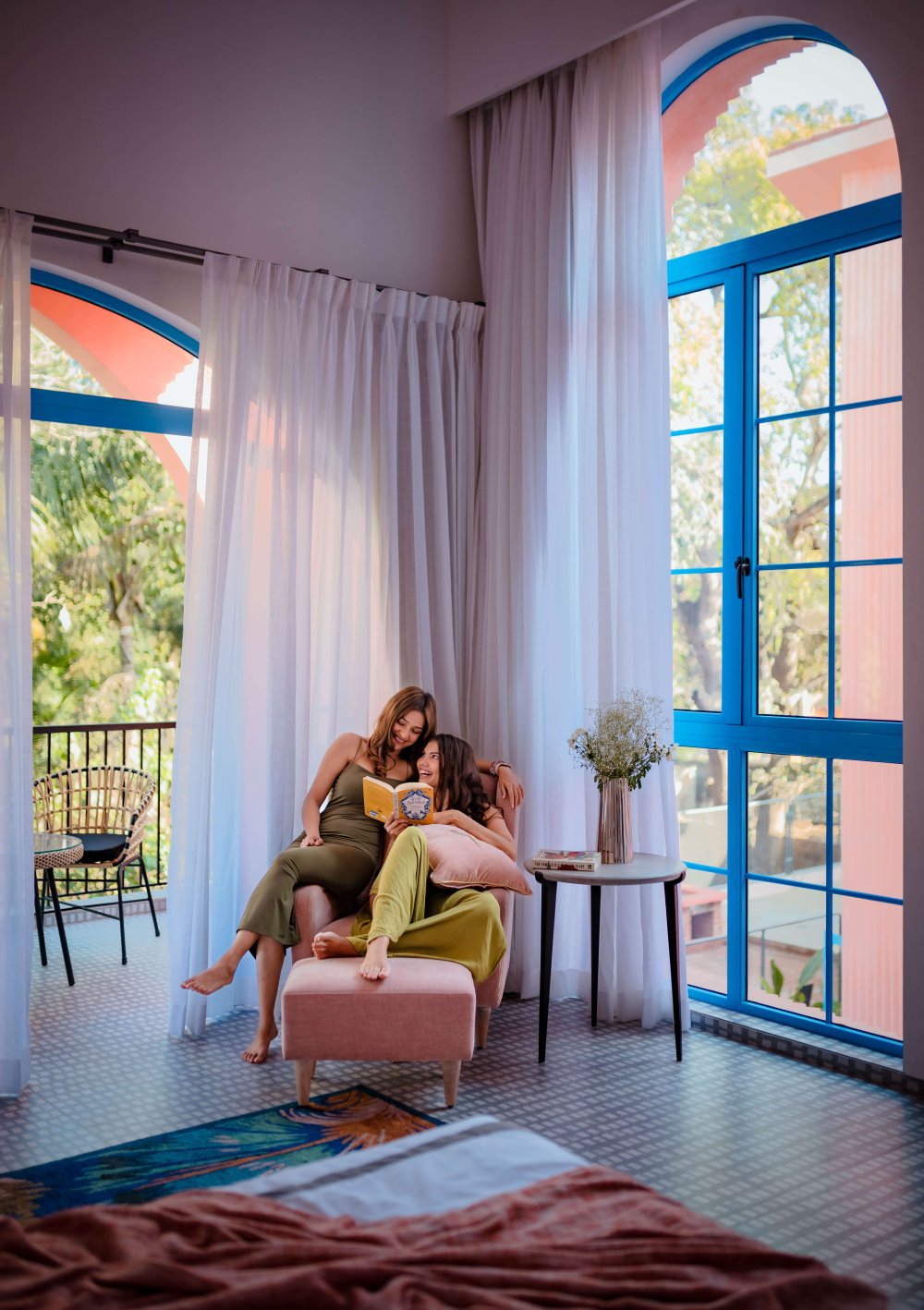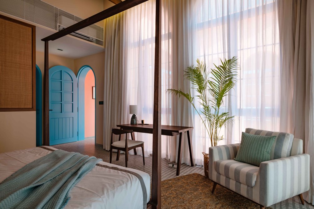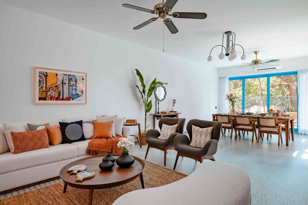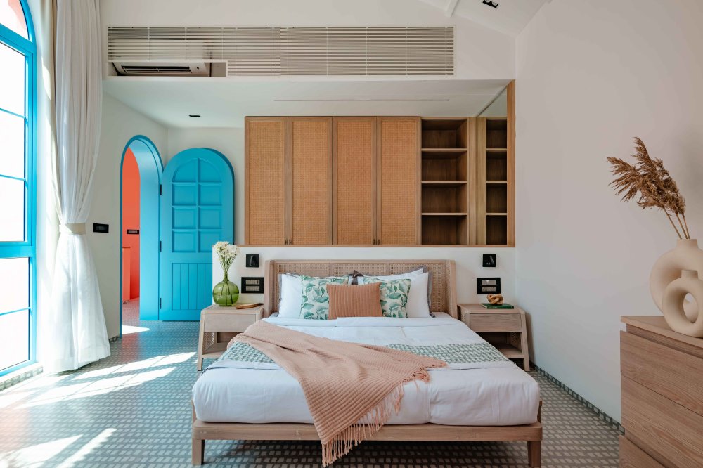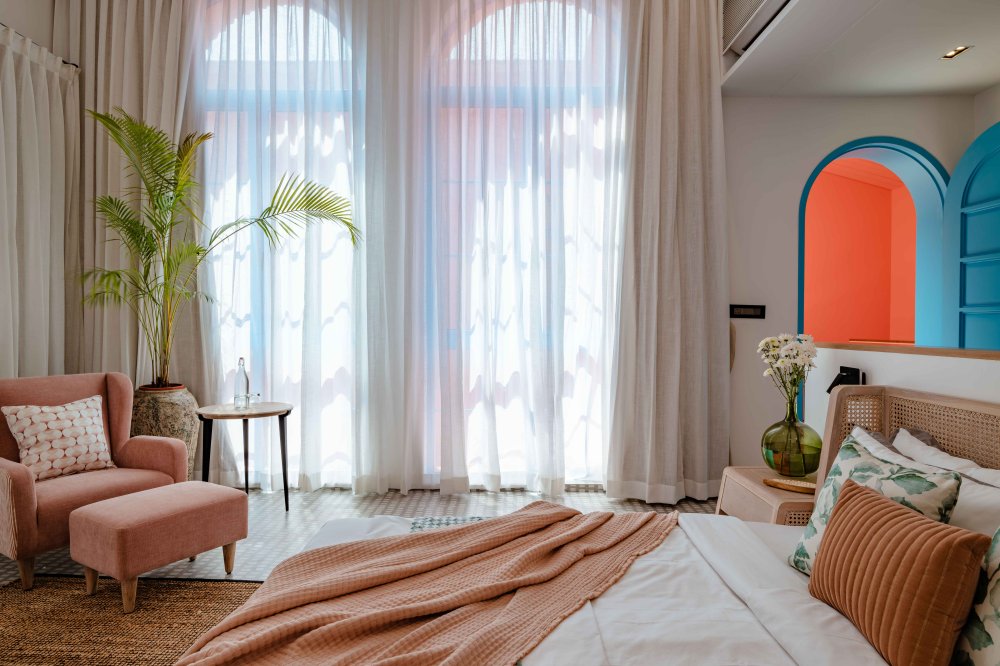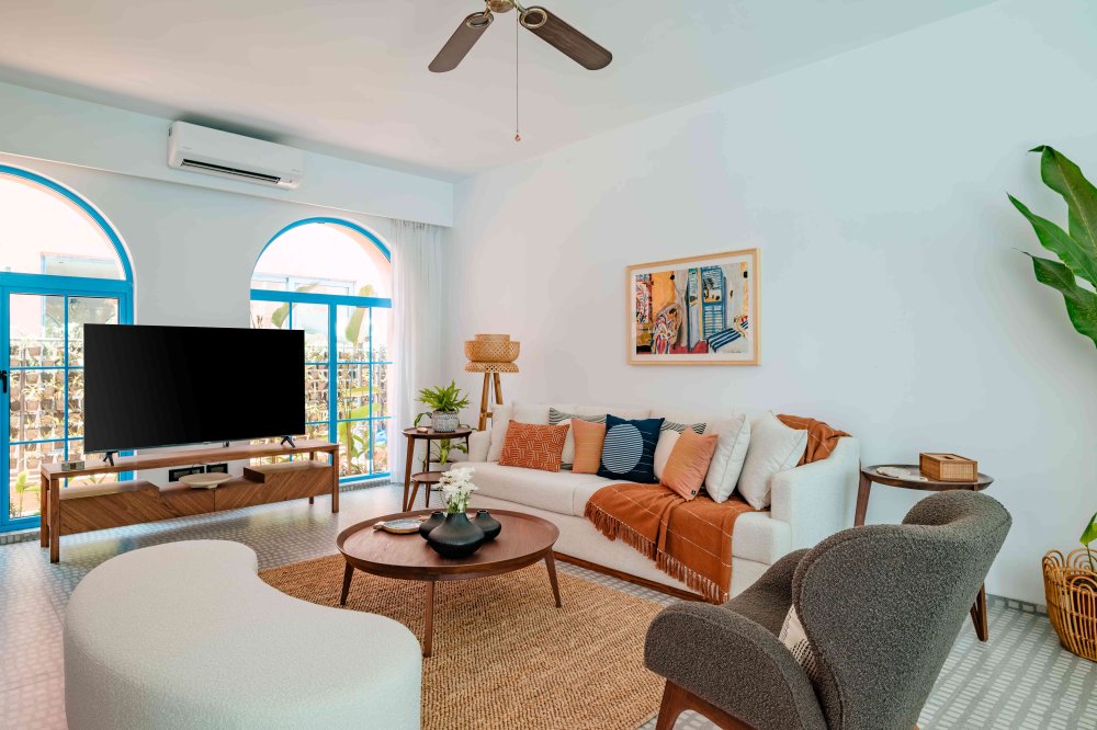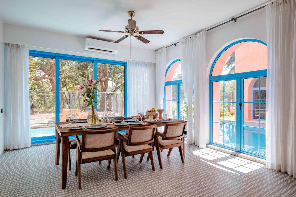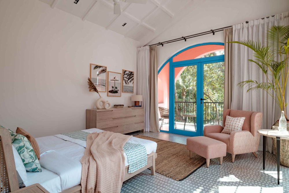Step into the laid-back charm of Rubia, a 3BHK tropical retreat nestled in the heart of Mandrem, North Goa. One of six identical villas in a thoughtfully designed gated complex, this home brings together bold architecture, playful design, and open-air living. With its peach-hued facade, striking blue windows, and a private pool courtyard at its center, Rubia is a modern homage to Goa’s heritage—perfect for intimate escapes or larger group getaways when booked together.