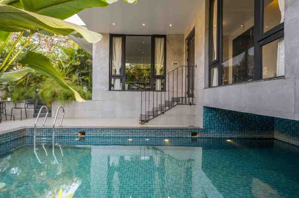 - The villa comes with a fully equipped kitchen, which is sufficient for long stays too. It includes a microwave, electric kettle, refrigerator, OTG, dishes and silverware, stove, cooking basics (pots and pans), salt and pepper, wine glasses, dining table, and toaster