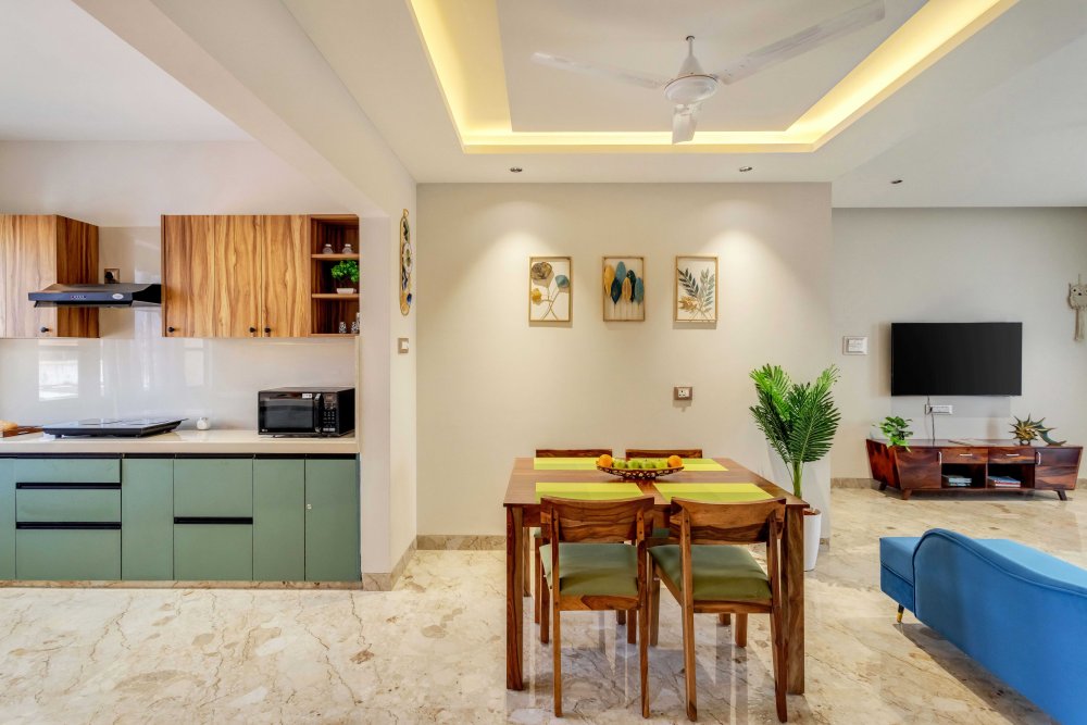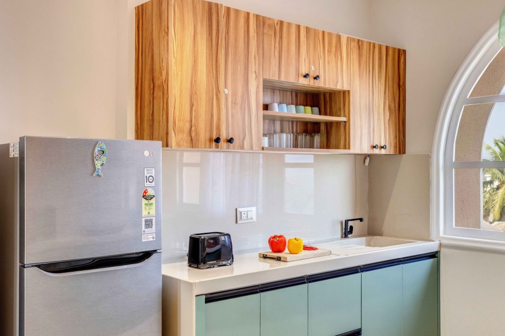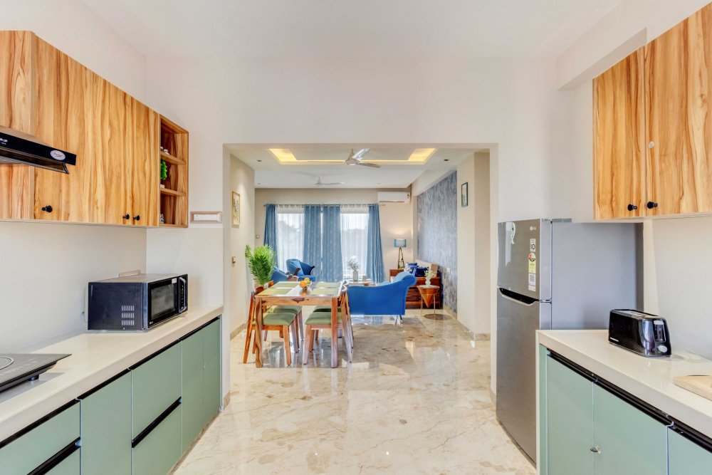 - The home comes with a fully equipped kitchen, which is sufficient for long stays too. It includes a microwave, electric kettle, refrigerator, OTG, dishes and silverware, stove, cooking basics (pots and pans), salt and pepper, wine glasses, dining table, and toaster
