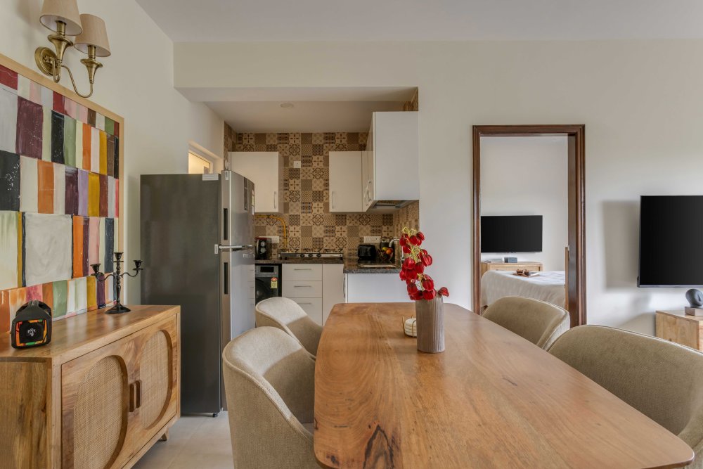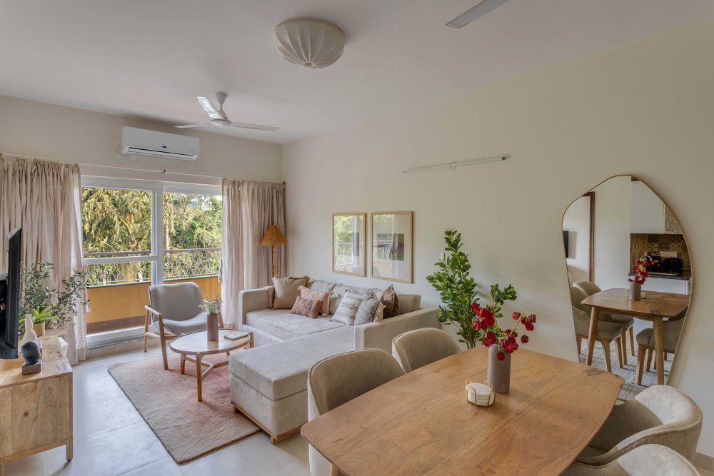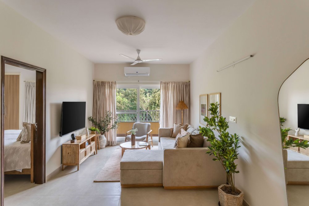 A luxurious 1BHK apartment in the heart of Candolim, North Goa, just a 5-minute drive from the beach. This exquisitely designed space features a stylish living room, modern kitchen, and elegant bathroom. Enjoy essential amenities such as a spacious swimming pool and a children’s park. Nestled in a plush, urban area, the apartment offers stunning views of lush greenery and the soothing sounds of birds, creating a serene and divine atmosphere.