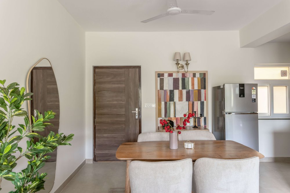 - The home comes with a fully equipped kitchen, which is sufficient for long stays too. It includes a microwave, electric kettle, refrigerator, OTG, dishes and silverware, stove, cooking basics (pots and pans), salt and pepper, wine glasses, dining table, and toaster