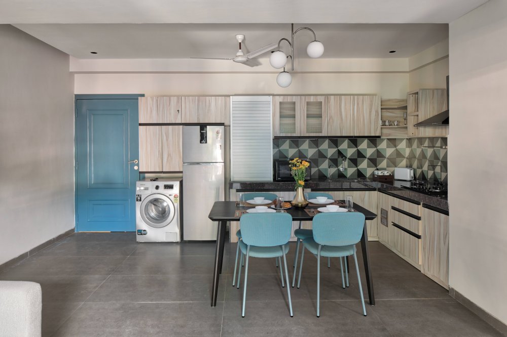 - The home comes with a fully equipped kitchen, which is sufficient for long stays too. It includes a microwave, electric kettle, refrigerator, OTG, dishes and silverware, stove, cooking basics (pots and pans), salt and pepper, wine glasses, dining table, and toaster