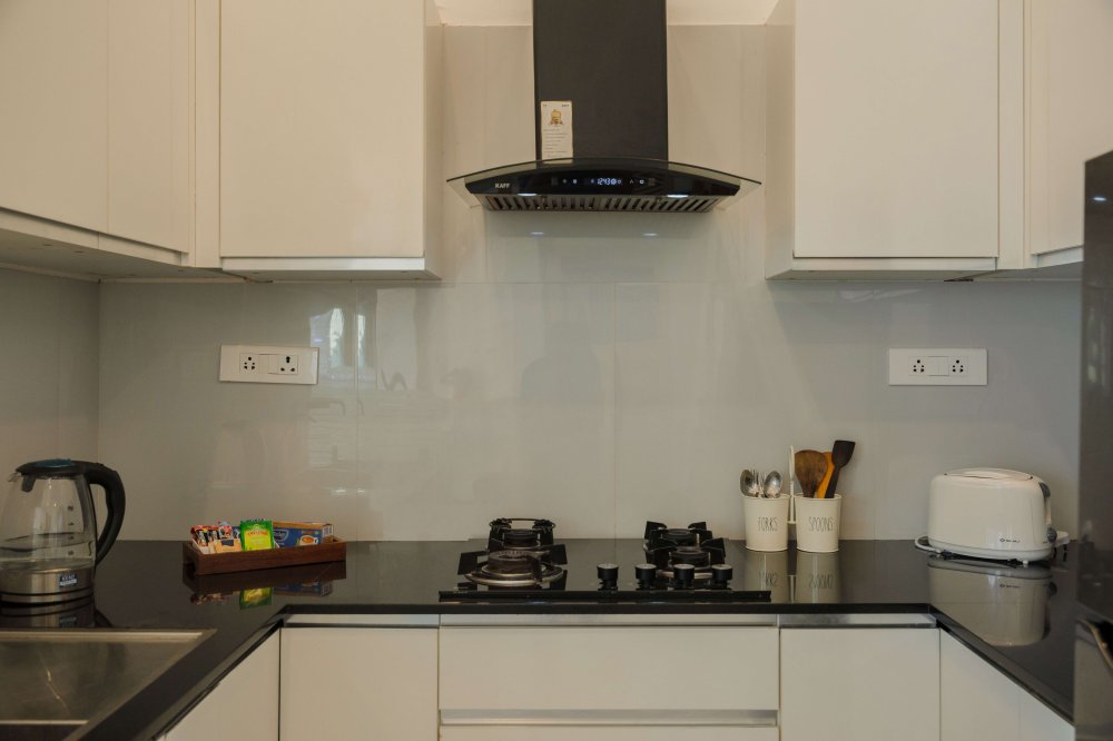 - The home comes with a fully equipped kitchen, which is sufficient for long stays too. It includes a microwave, electric kettle, refrigerator, OTG, dishes and silverware, stove, cooking basics (pots and pans), salt and pepper, wine glasses, dining table, and toaster