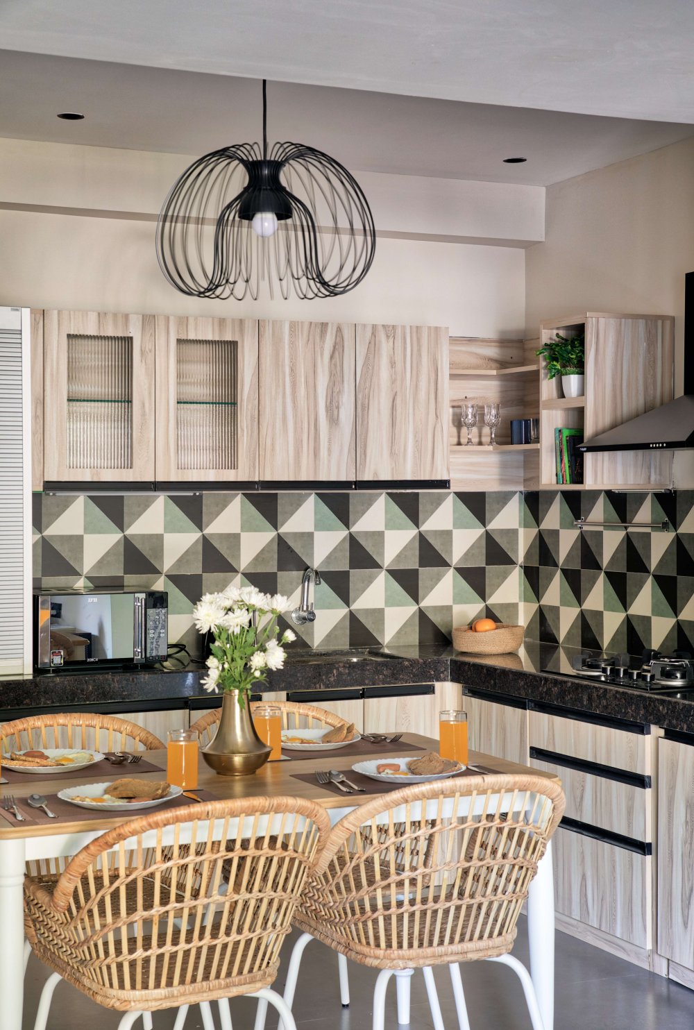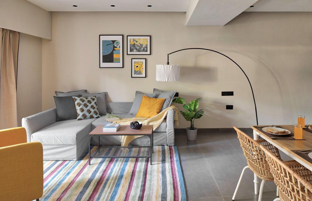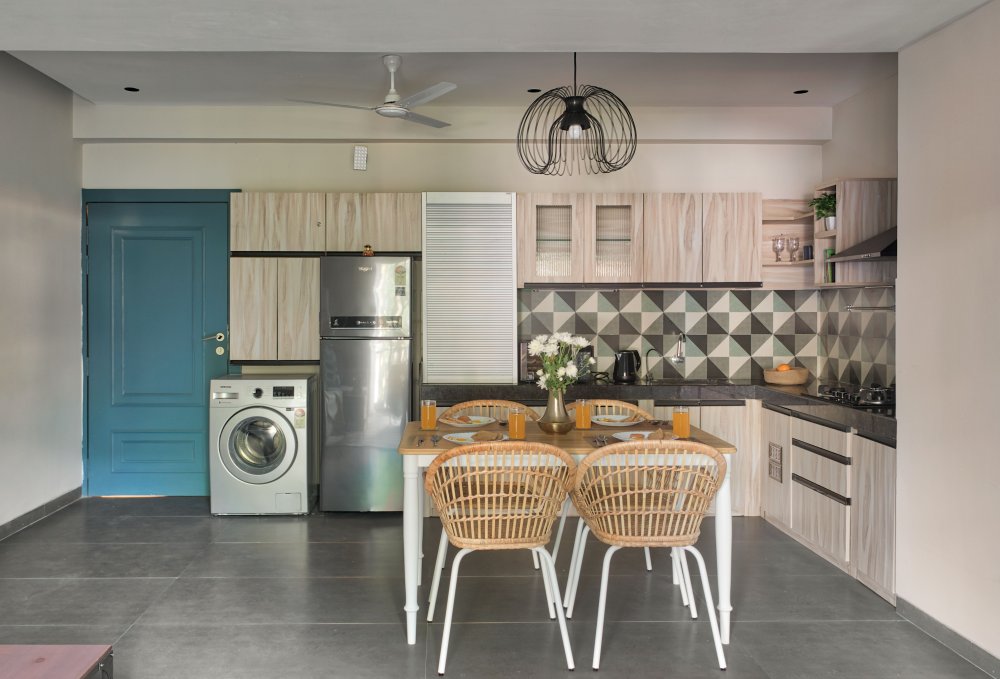 - The home comes with a fully equipped kitchen, which is sufficient for long stays too. It includes a microwave, electric kettle, refrigerator, OTG, dishes and silverware, stove, cooking basics (pots and pans), salt and pepper, wine glasses, dining table, and toaster