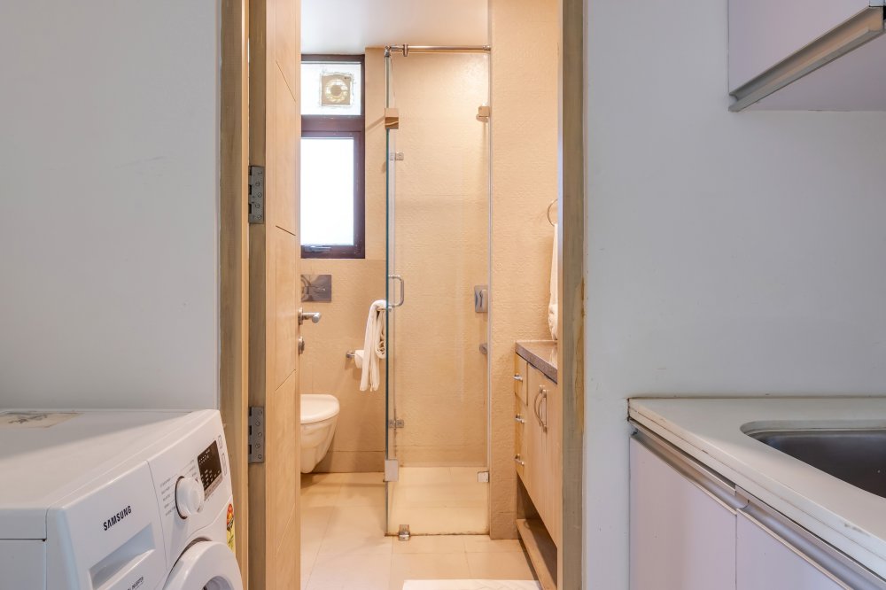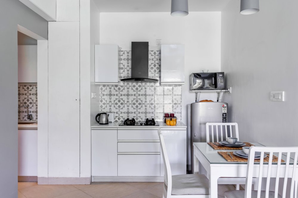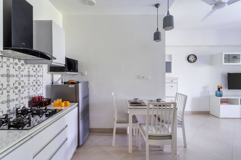 - The home comes with a fully equipped kitchen, which is sufficient for long stays too. It includes a microwave, electric kettle, refrigerator, OTG, dishes and silverware, stove, cooking basics (pots and pans), salt and pepper, wine glasses, dining table, and toaster