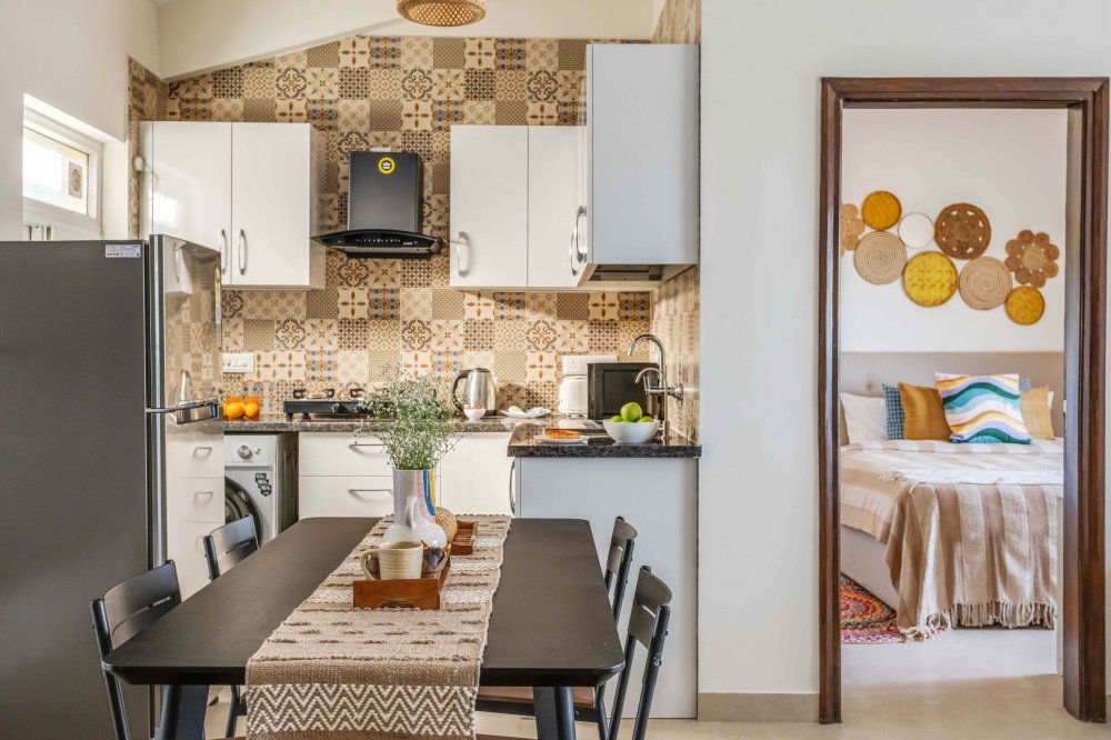 - The home comes with a fully equipped kitchen, which is sufficient for long stays too. It includes a microwave, electric kettle, refrigerator, dishes and silverware, stove, cooking basics (pots and pans), salt and pepper, wine glasses, dining table, and toaster