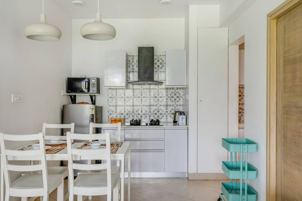 - The home comes with a fully equipped kitchen, which is sufficient for long stays too. It includes a microwave, electric kettle, refrigerator, OTG, dishes and silverware, stove, cooking basics (pots and pans), salt and pepper, wine glasses, dining table, and toaster