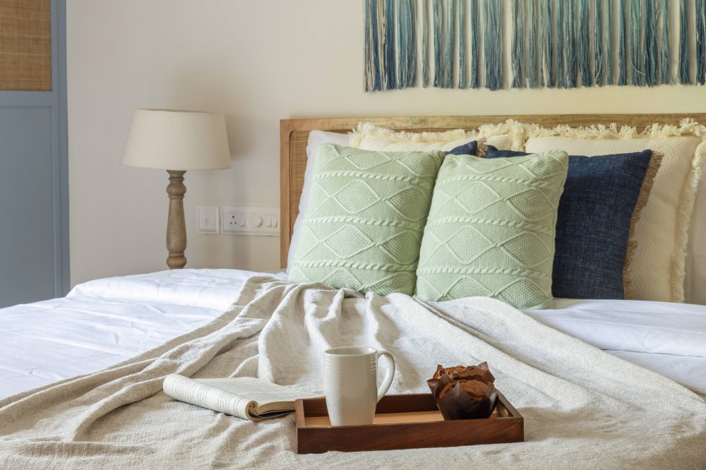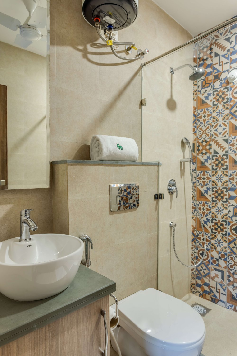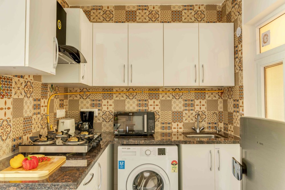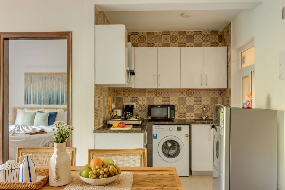 - The home comes with a fully equipped kitchen, which is sufficient for long stays too. It includes a microwave, electric kettle, refrigerator, OTG, dishes and silverware, stove, cooking basics (pots and pans), salt and pepper, wine glasses, dining table, and toaster