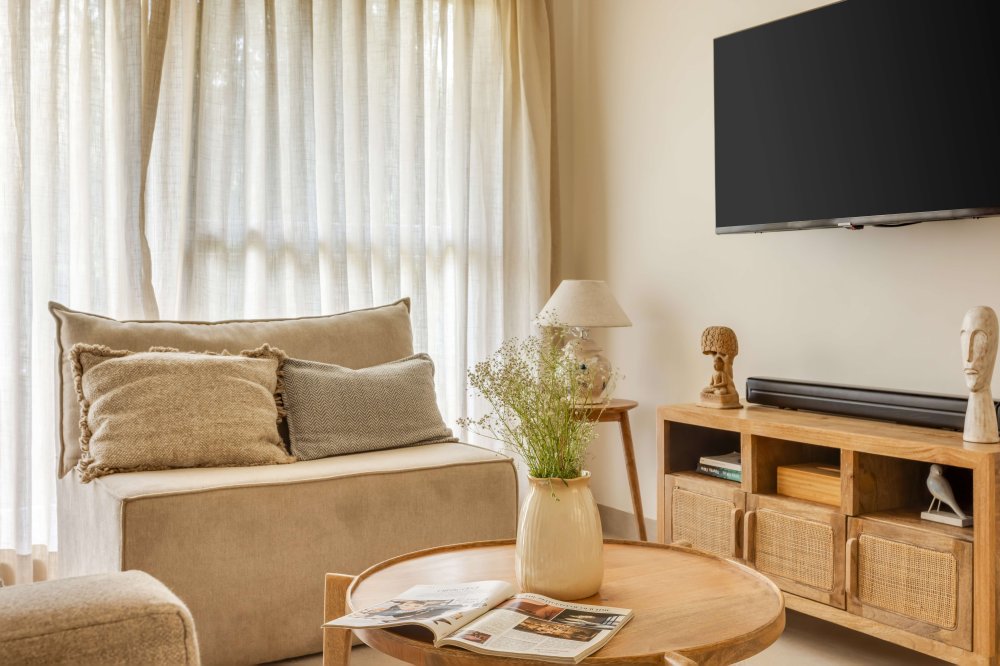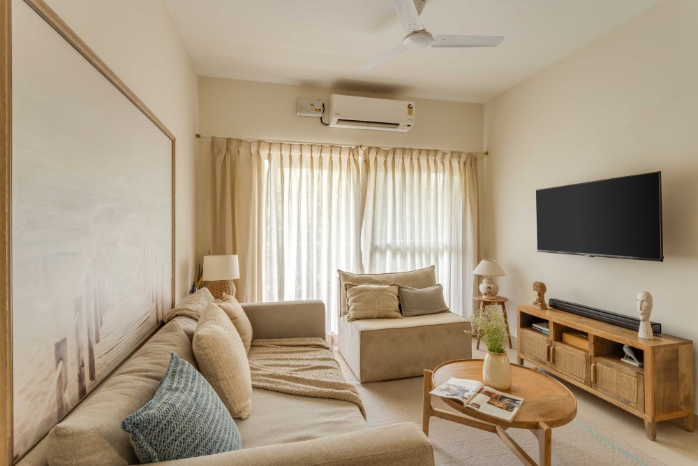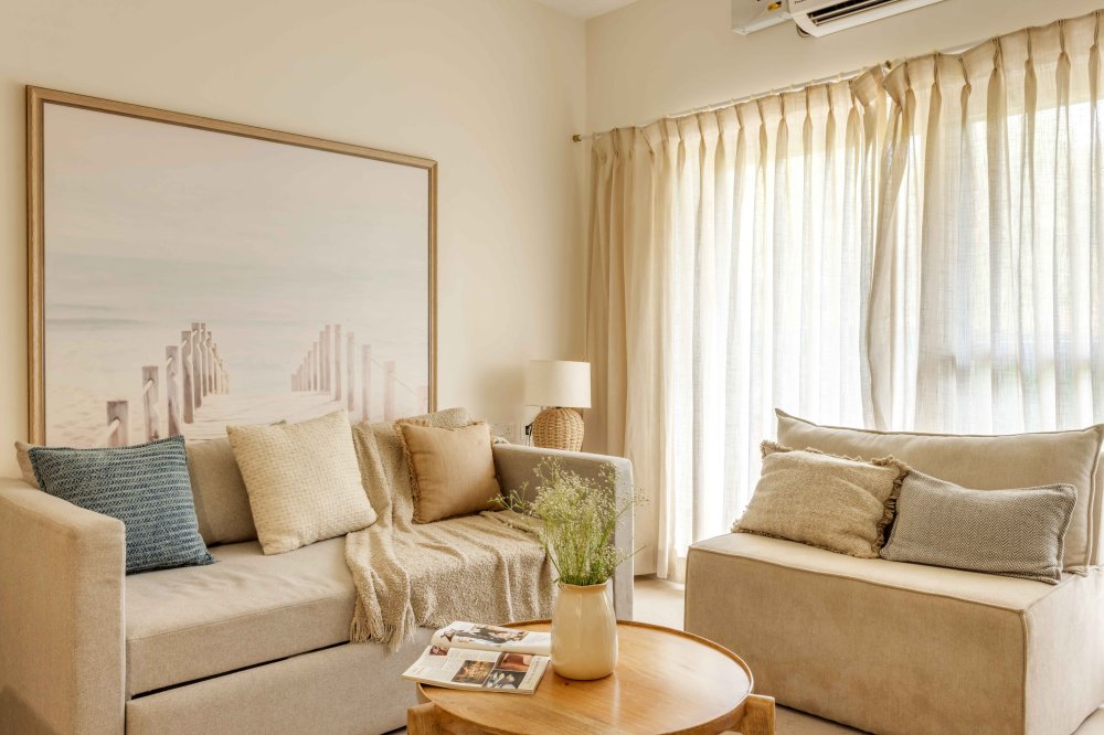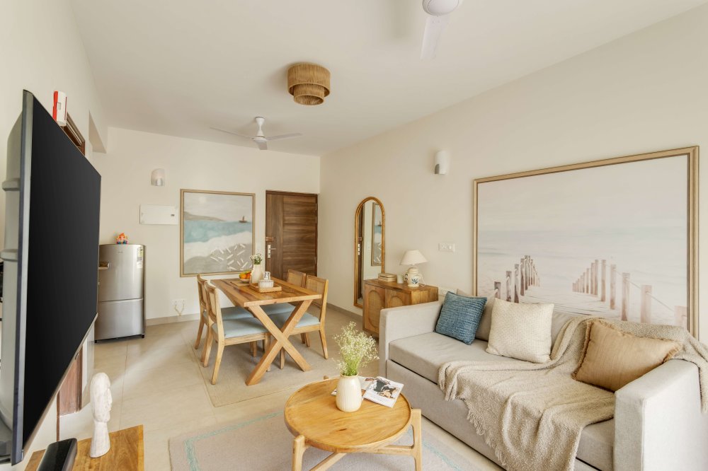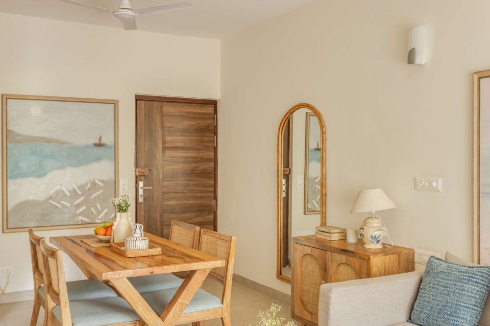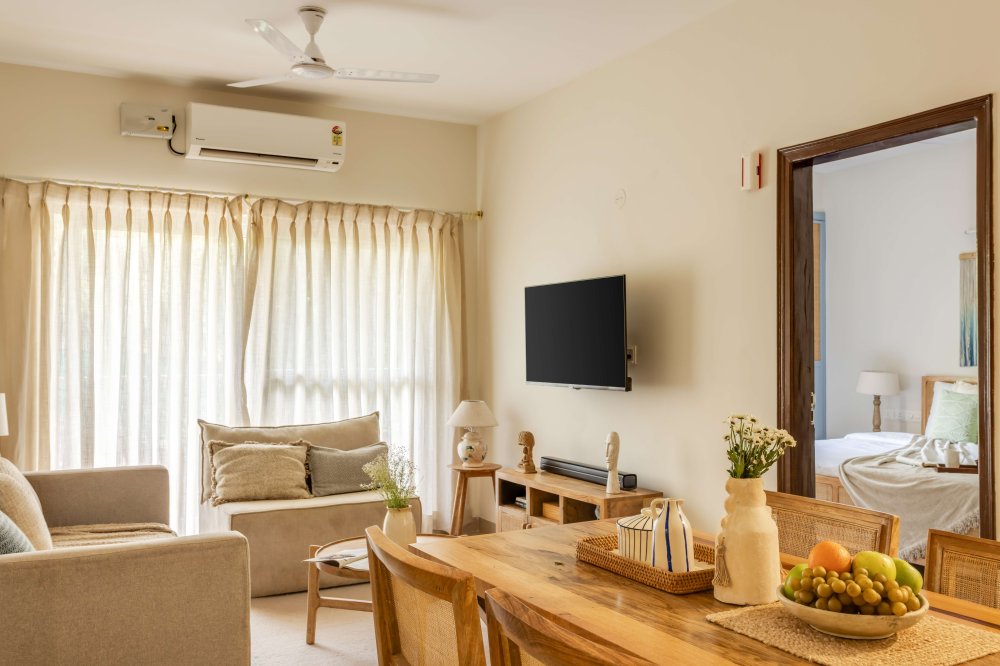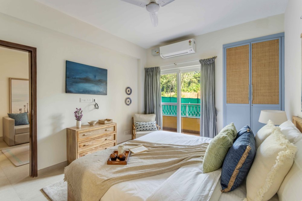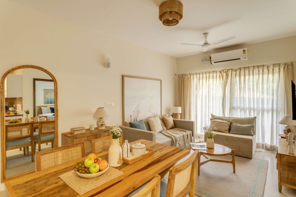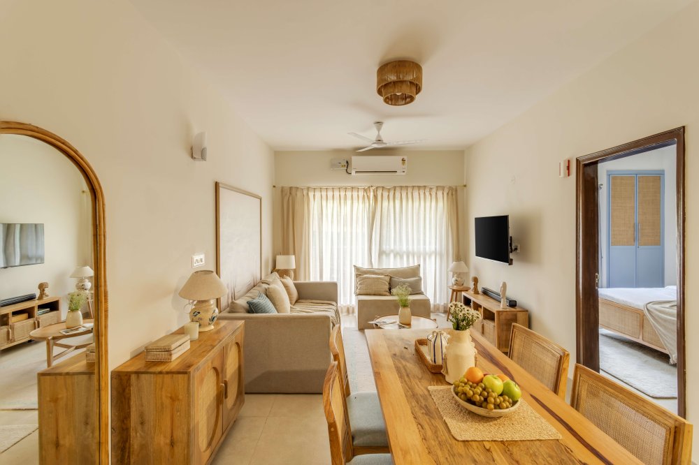 A luxurious 1BHK apartment in the heart of Candolim, North Goa, just a 5-minute drive from the beach. This exquisitely designed space features a stylish living room, modern kitchen, and elegant bathroom. Enjoy essential amenities such as a spacious swimming pool and a children’s park. Nestled in a plush, urban area, the apartment offers stunning views of lush greenery and the soothing sounds of birds, creating a serene and divine atmosphere.