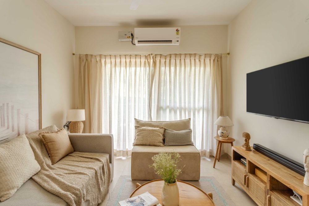 Step into this luxury 1BHK apartment featuring a spacious living room seamlessly connected to a fully equipped kitchen. The bedroom includes an attached bathroom and a private balcony, perfect for relaxing with views of lush greenery and the soothing sounds of nature.