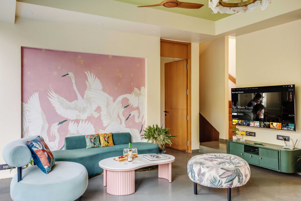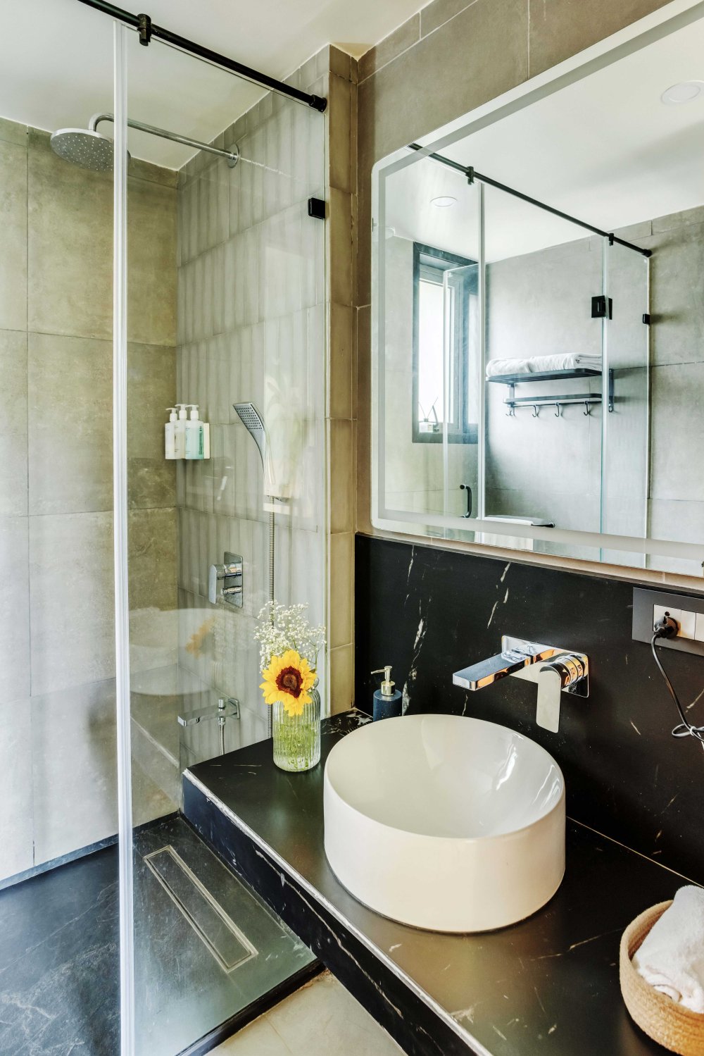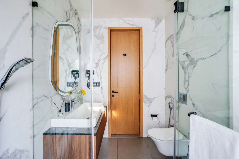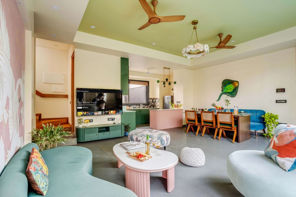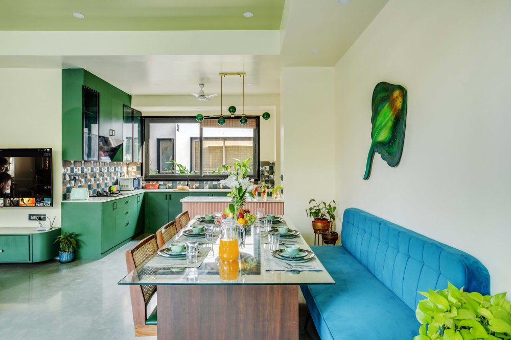 - The home comes with a fully equipped kitchen, which is sufficient for long stays too. It includes a microwave, electric kettle, refrigerator, OTG, dishes and silverware, stove, cooking basics (pots and pans), salt and pepper, wine glasses, dining table, and toaster